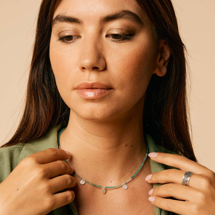 This Be In Nature Silver Beaded Necklace by Charlotte's Web Jewellery radiates fresh vibrancy with its unique ombre design of faceted green onyx beads. A spiritual energy flows through the piece, with hammered silver discs adding an artisanal touch. Designed to be as versatile as it is beautiful, the necklace can be styled solo for minimalist elegance or layered with chokers and gemstone strands to create a bold summer stack. Channeling harmony, nature, and vitality, it is a perfect companion for beach days, office edits, and every moment in between.