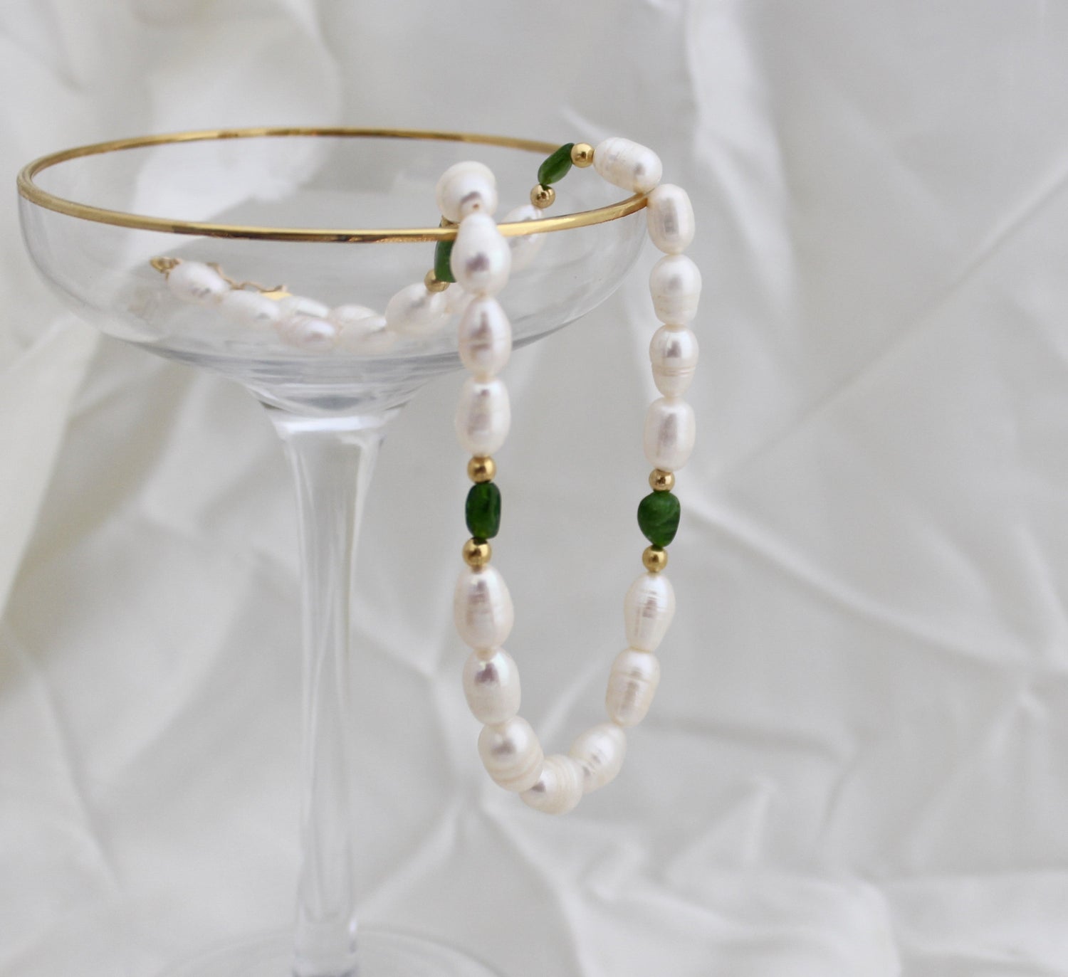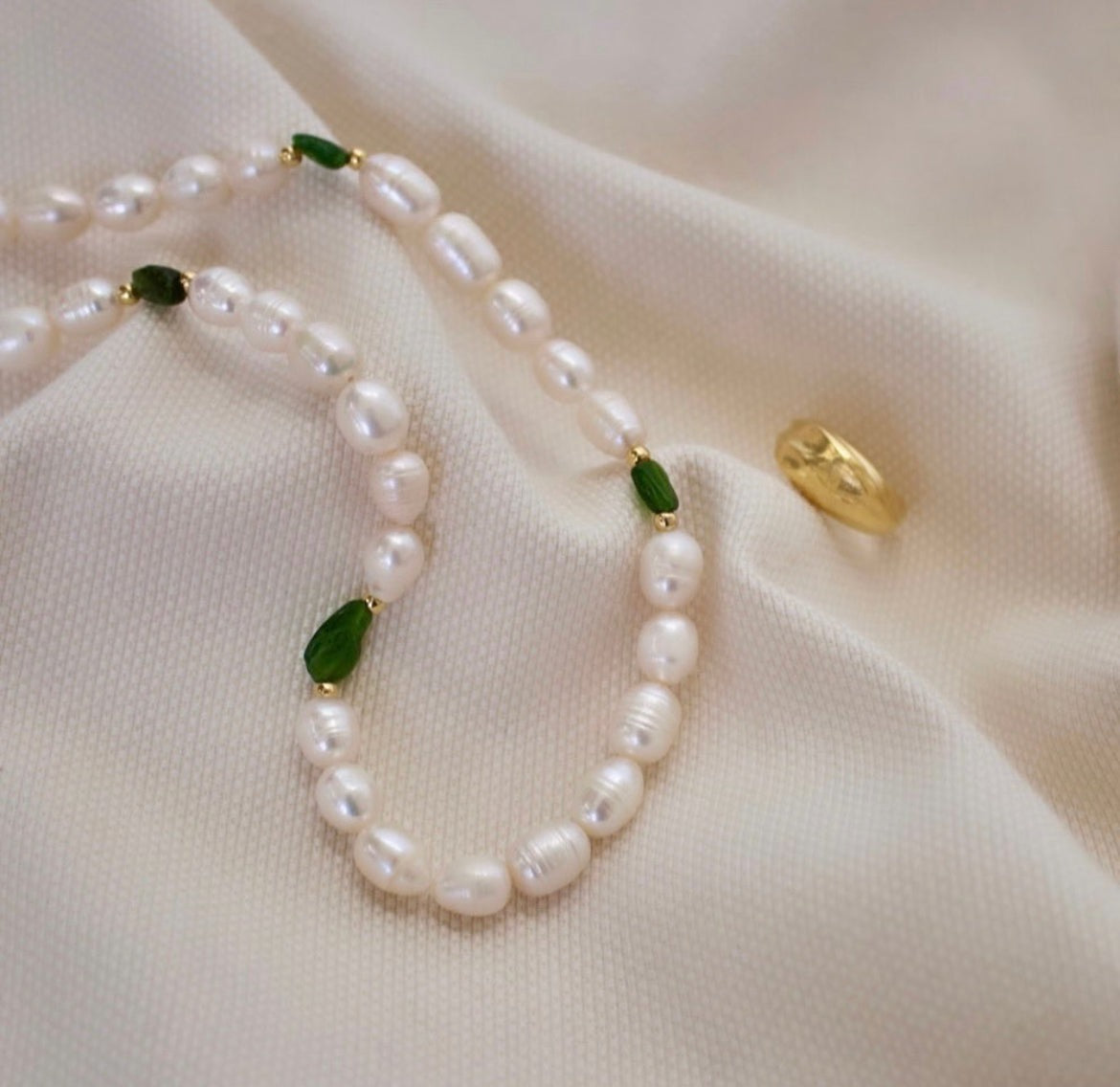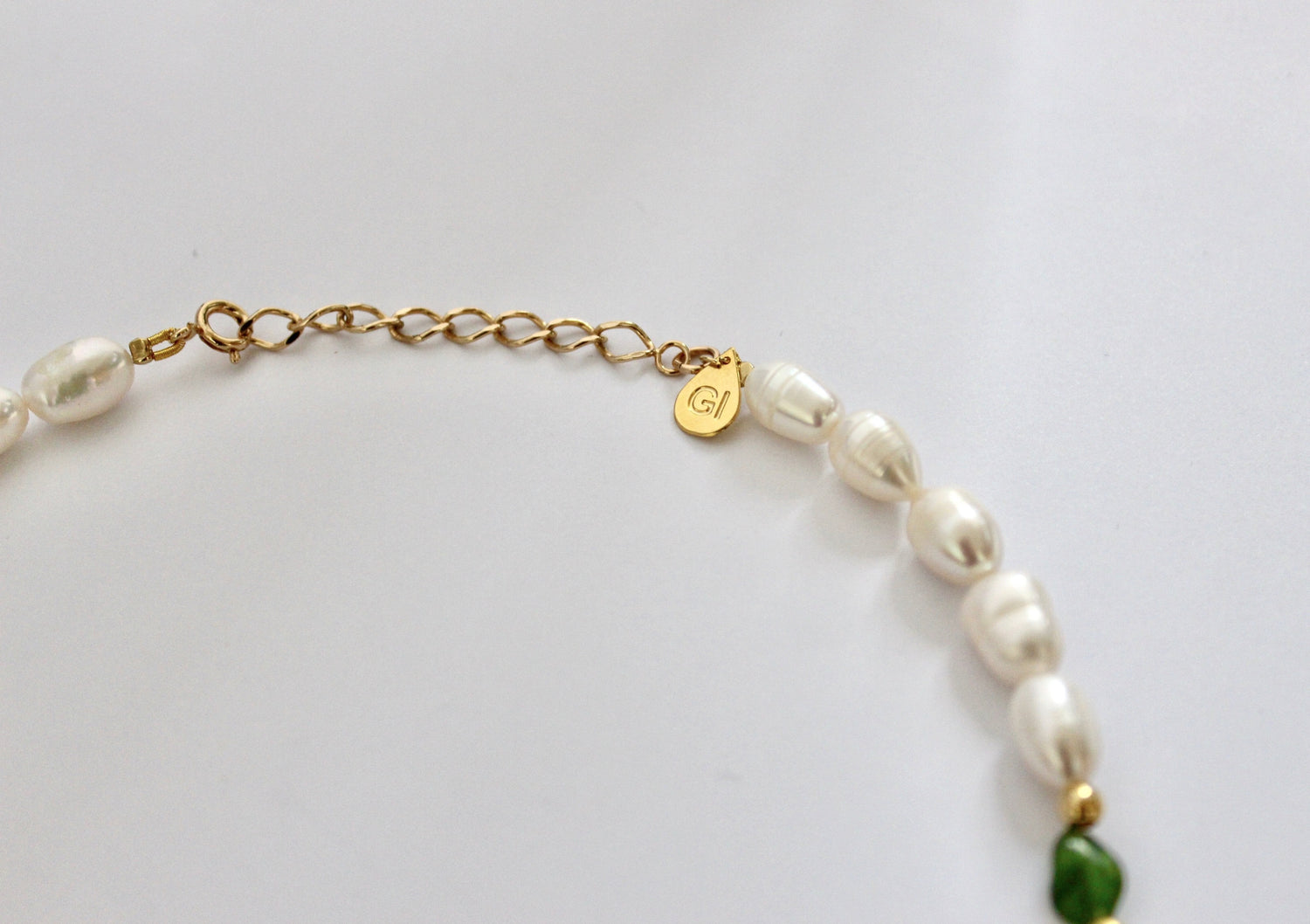 This necklace is made with freshwater pearls and green diopside stones. It is adjustable from 42-45cm in length and is made of sterling silver or 24 carats gold plated brass.