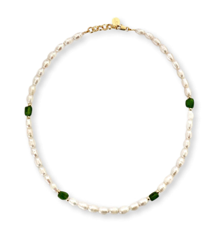The Georgia Necklace by Gem Island is a delicate piece that is beautiful on its own or layered with other fine chains. It features freshwater pearls and green diopside stones. Mother of pearl is a feminine mineral symbolizing faith and innocence, while diopside is a stone that helps to take root in the present moment. This necklace is a unique and meaningful accessory.