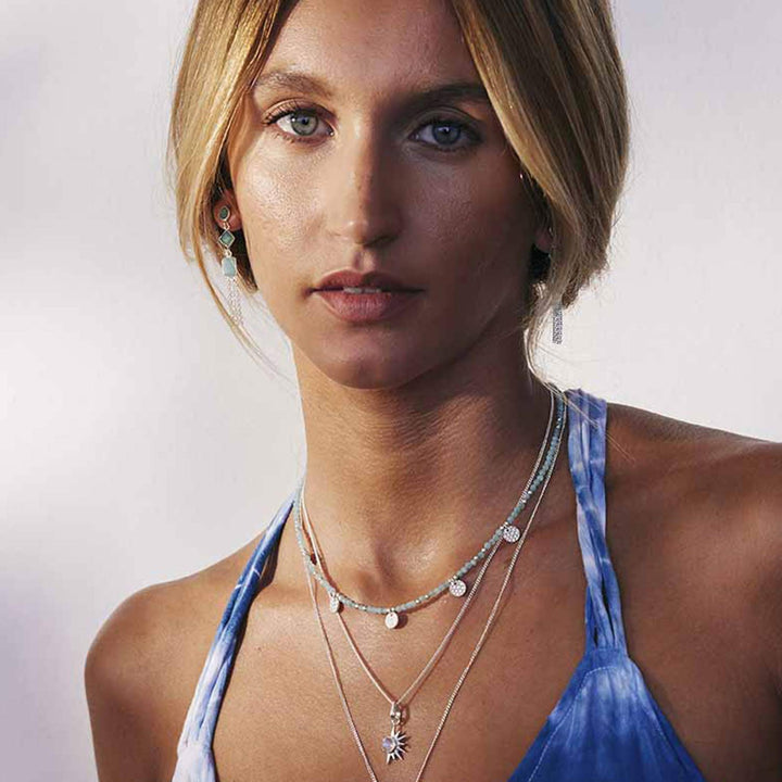 This Aegean Silver Beaded Necklace by Charlotte's Web Jewellery captures the essence of Mediterranean beauty. With aqua-hued amazonite beads and shimmering hammered silver discs, it evokes sunlit waves and coastal charm. Wear it solo for a delicate touch of colour or layer it with other summer necklaces for a chic, bohemian stack. Its soothing tones bring serenity, while its design channels wanderlust and carefree summer spirit.