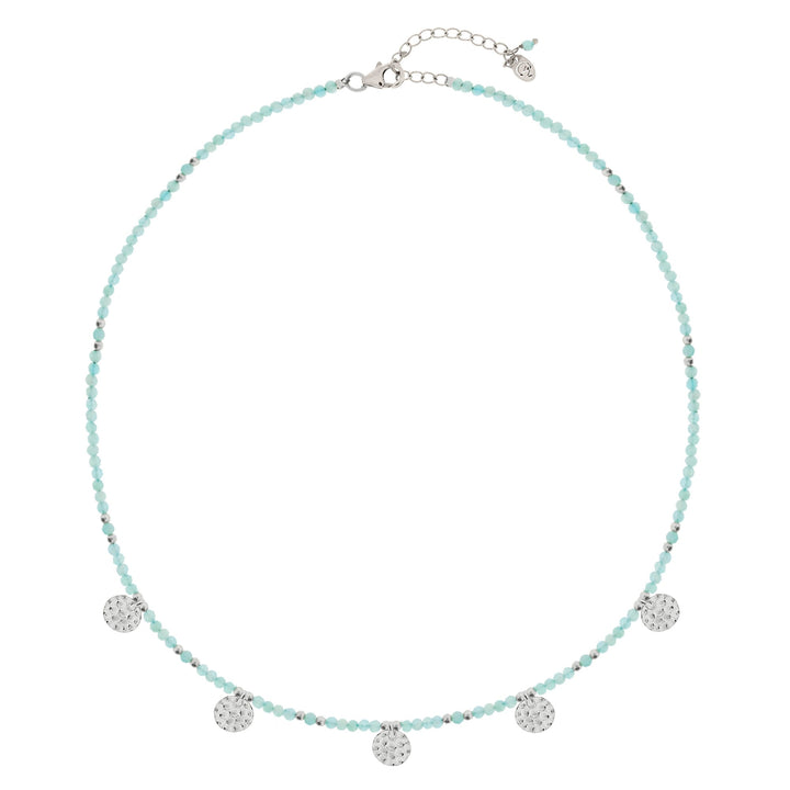 Handmade necklace with sterling silver and faceted amazonite beads, accented with hammered silver discs. Adjustable length with clasp fastening.
