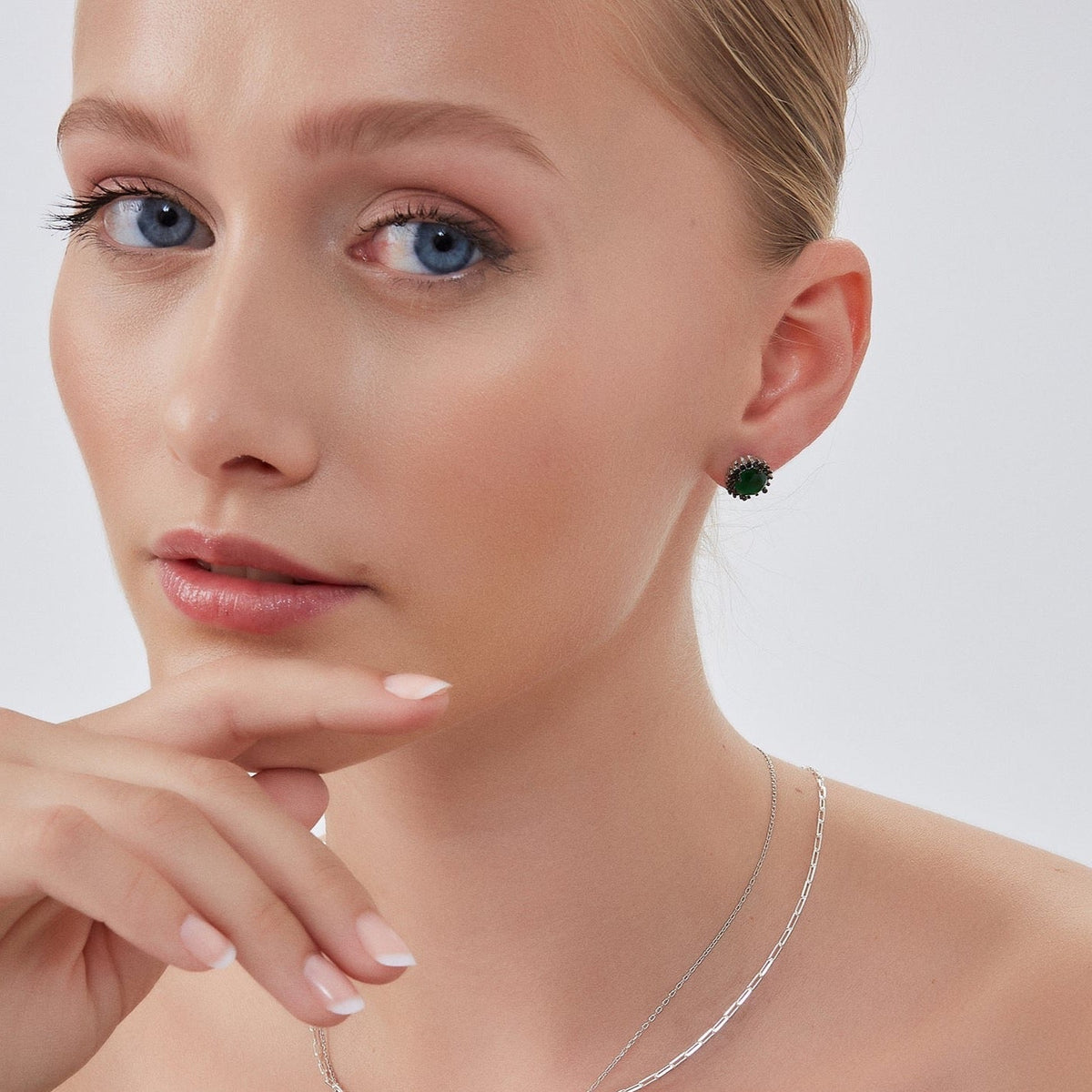 These stud earrings are crafted from sterling silver and feature black and emerald-colored stones.