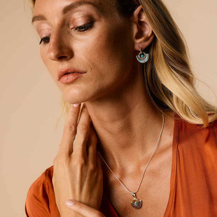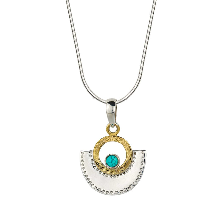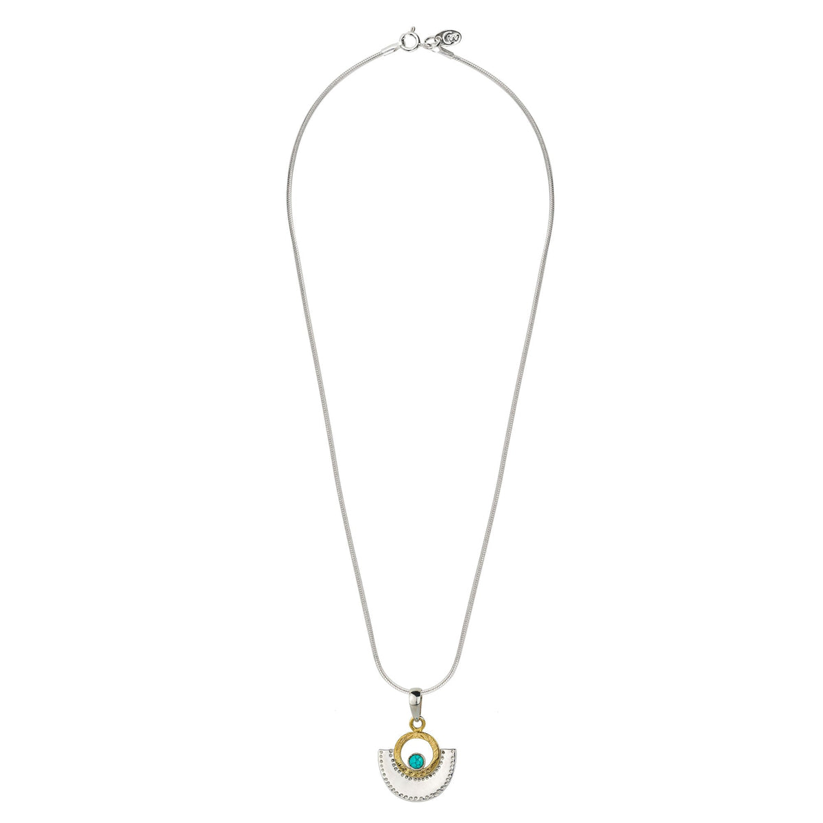 The Sundar Fan Silver Pendant Necklace by Charlotte's Web Jewellery in Turquoise is a mixed metal piece that is true to its name, "beautiful" in Hindi. This handcrafted necklace features a vibrant turquoise stone, believed to bring friendship and prosperity, on a silver snake chain with an arc pendant. It is made of sterling silver and brass.