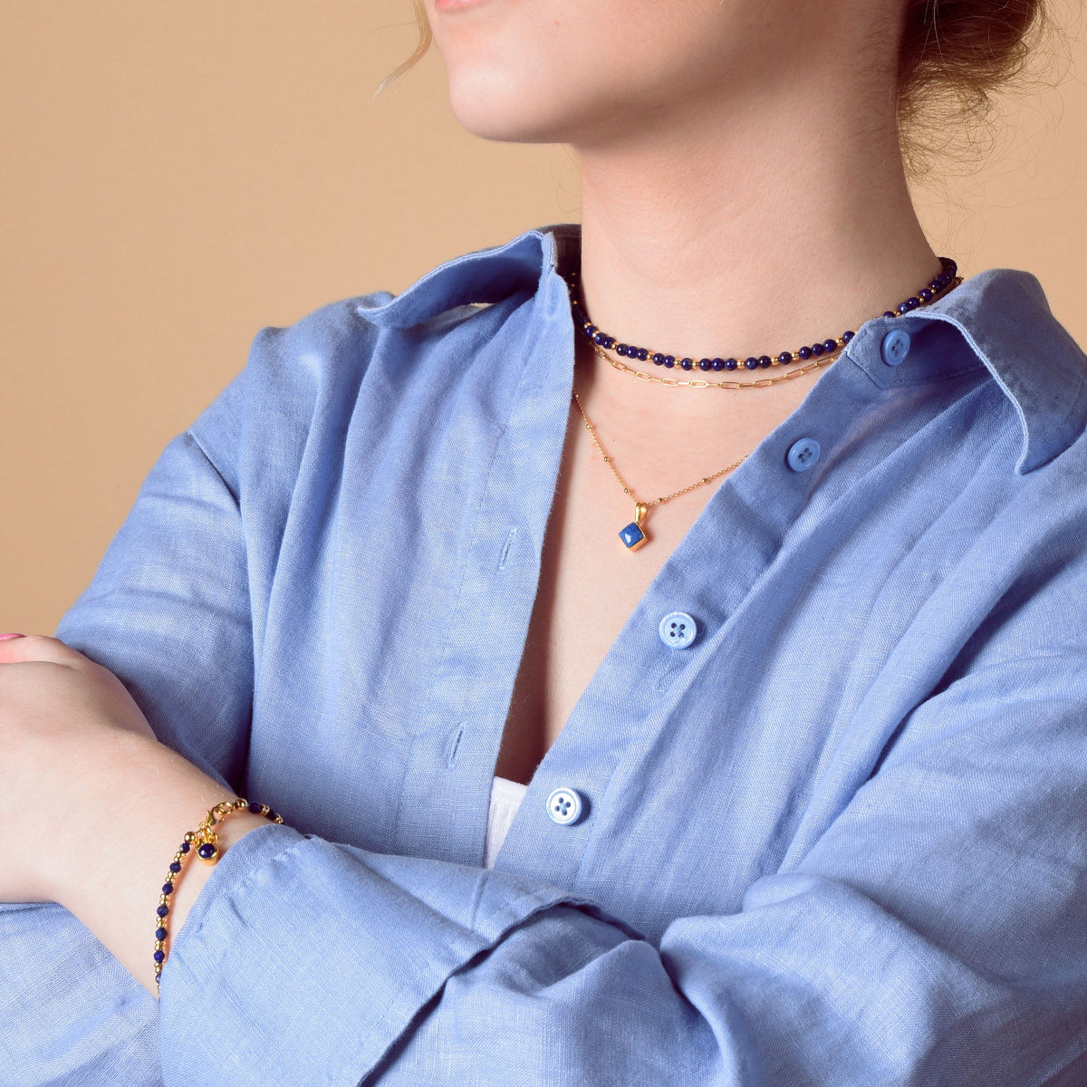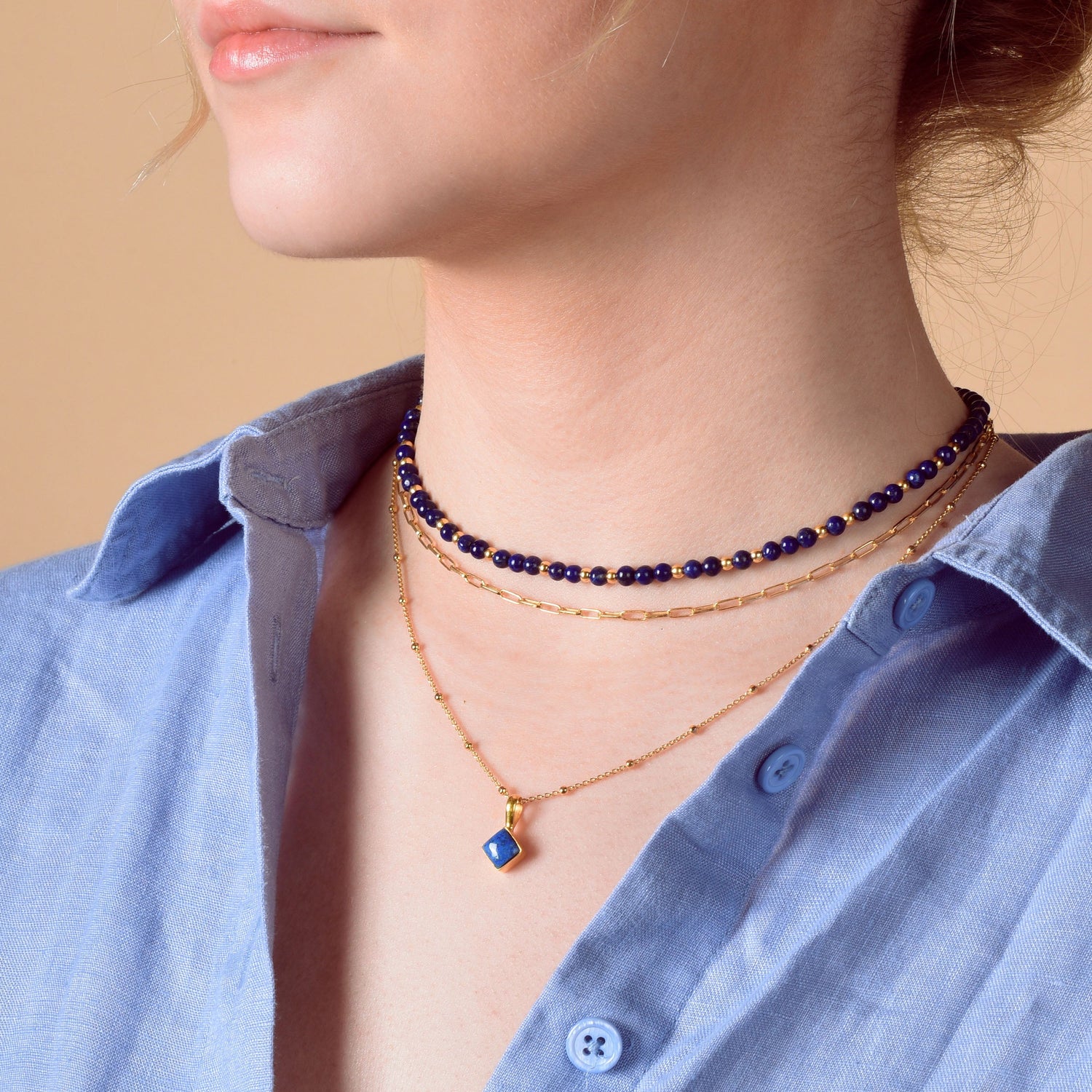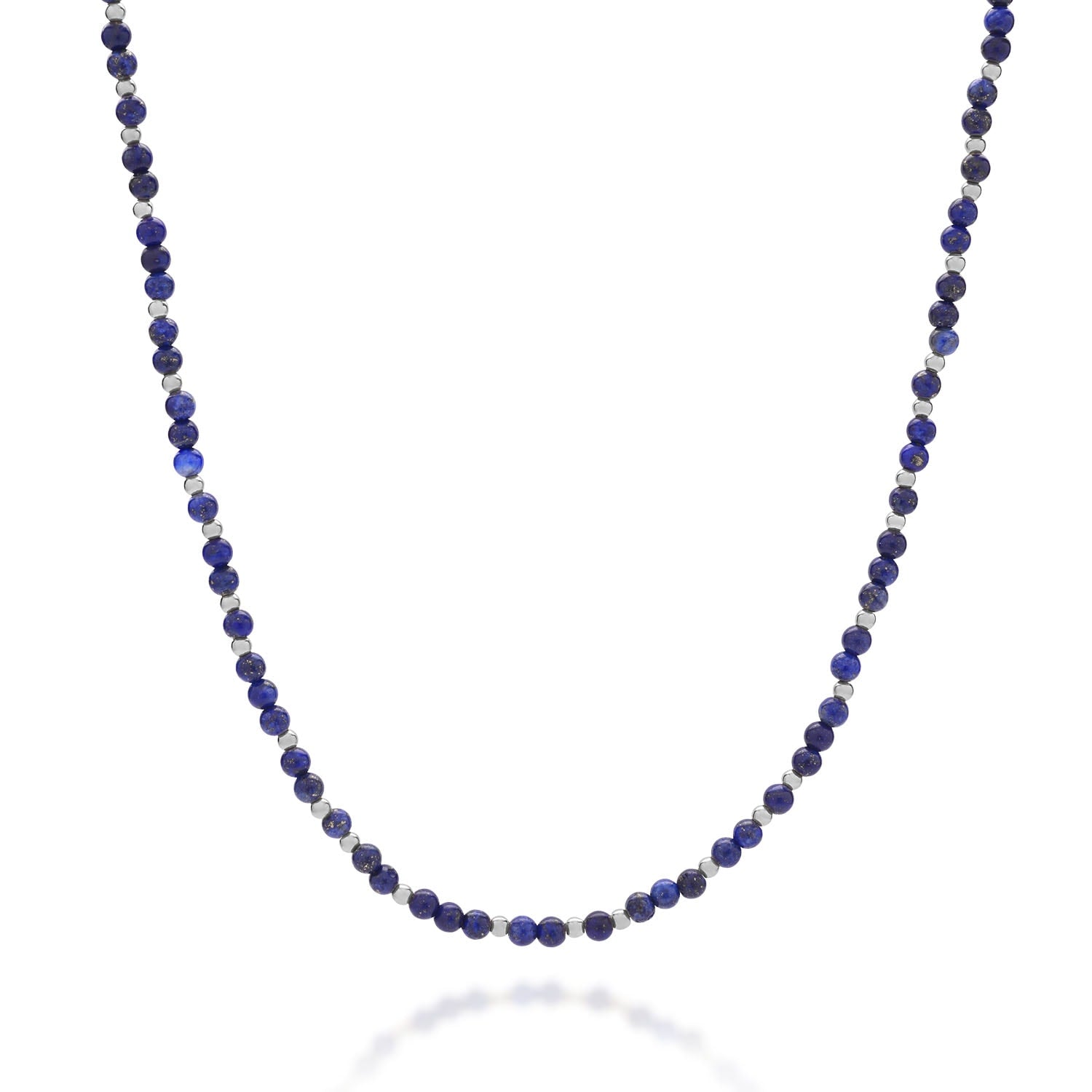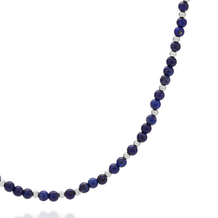 This necklace is handcrafted from eco-friendly sterling silver and features a natural lapis lazuli gemstone and beads. It is an adjustable length.