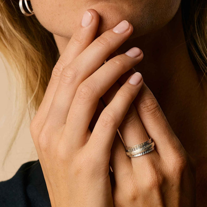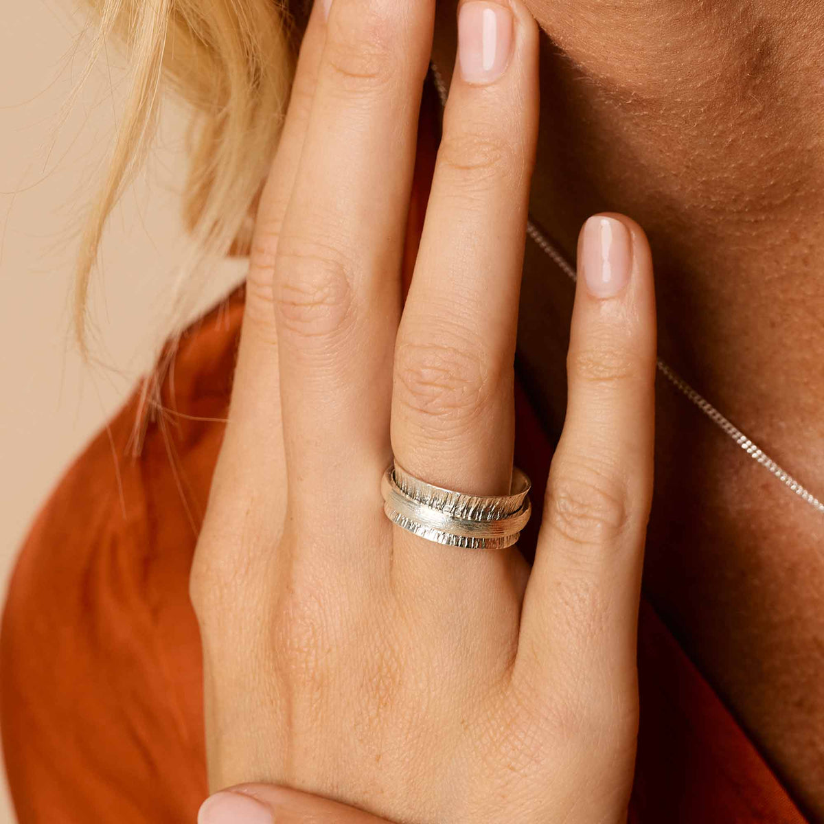 This Nature Gratitude Silver Spinning Ring by Charlotte's Web Jewellery is a grounding and mindful accessory. Inspired by Tibetan prayer wheels, its spinning motion invites you to slow down, breathe deeply, and embrace the present moment. Handcrafted in sterling silver, it is a celebration of renewal and the quiet strength of the natural world, making it a gentle reminder to seek balance and calm in your day.