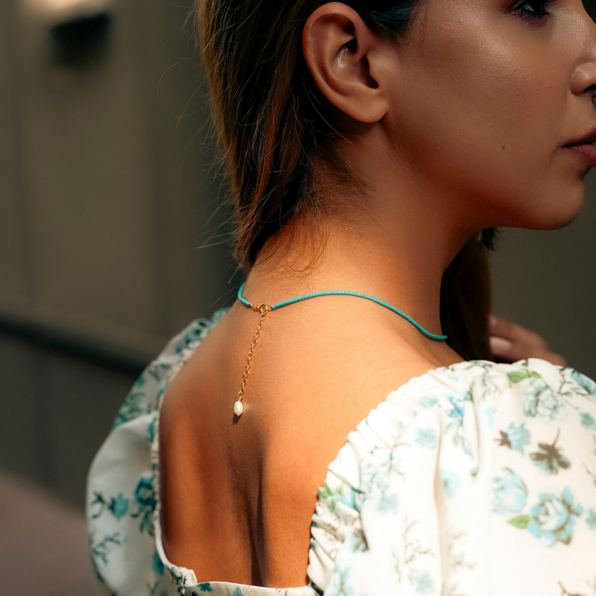 This necklace is made of 100% sterling silver and features natural turquoise and a pearl.