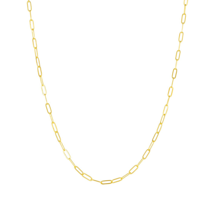 This necklace is fashioned from 925 recycled sterling silver with a gold finish. It features a paperclip large rectangular linking chain, an adjustable length, and a lobster claw lock.