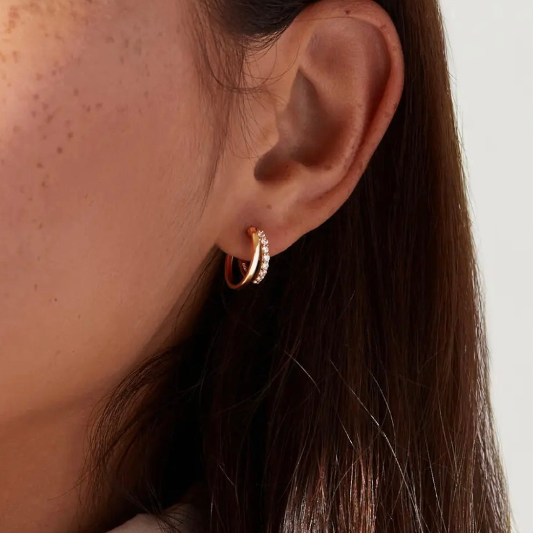 These Gold Double Huggie Hoop Zirconia Studded Earrings by Nazzar blend sleek minimalism with radiant sparkle. Featuring two polished gold hoops lined with shimmering zirconia, they bring contemporary elegance to any look. Waterproof, tarnish-free, and versatile, they’re designed to shine for years to come.