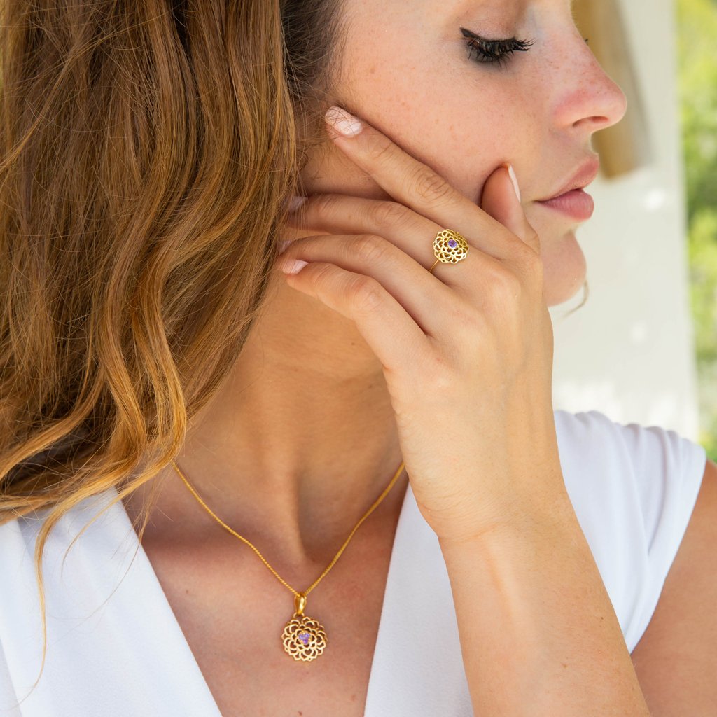This Crown Chakra Gold Vermeil Ring by Charlotte's Web Jewellery is a beautiful piece that helps you connect to your unique higher power. The crown chakra, or Sahasrara, is represented by a lotus flower with a thousand petals, and this ring allows you to open up to spiritual insight. The healing amethyst stone will help to balance the chakra, enveloping the wearer with protection and a deeper connection to their spiritual self. This is a meaningful and stylish accessory for spiritual souls.
