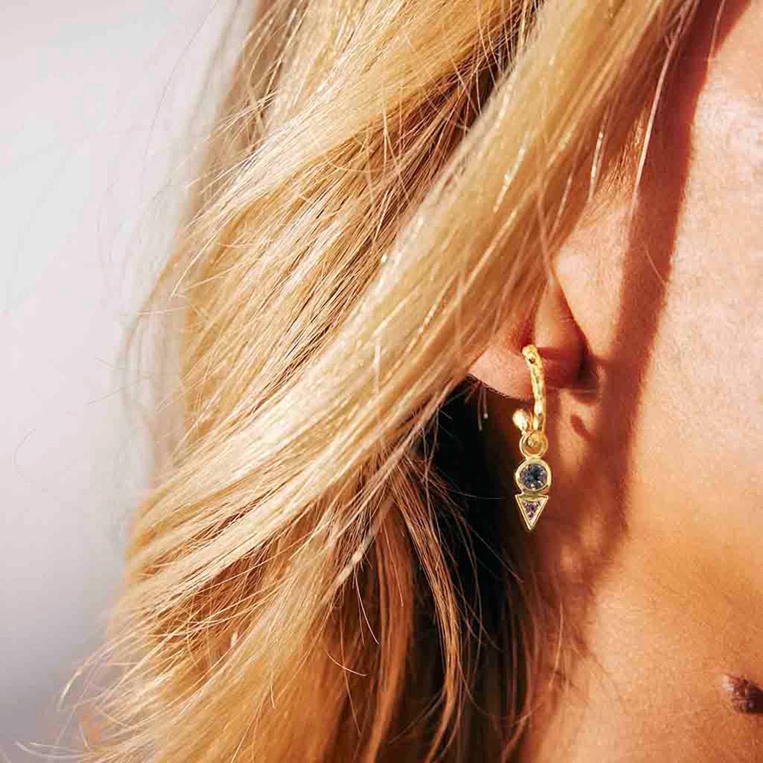 These Trikona Peace Gold Vermeil Hoop Earrings - Blue Topaz by Charlotte’s Web Jewellery are inspired by the Sanskrit word “Trikona,” meaning triangle. Set with sparkling blue topaz, November and December’s birthstone, these hoops symbolise serenity and balance. Radiating peace and subtle glamour, they are both spiritual and stylish, making them a perfect gift.