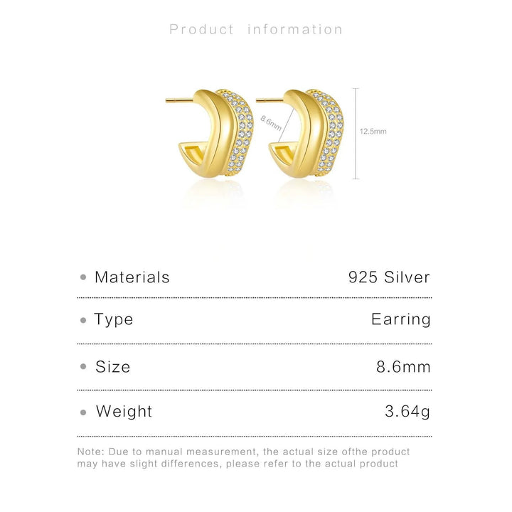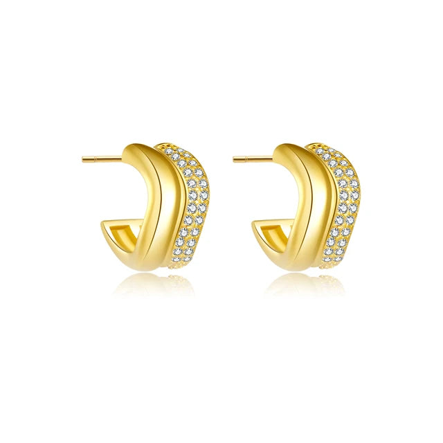 100% recycled sterling silver base with thick 14k gold plating. Pavé cubic zirconia stones. Waterproof, tarnish-free, hypoallergenic. Includes 925SS stamp, microfiber cloth, pouch, and 1-year warranty.