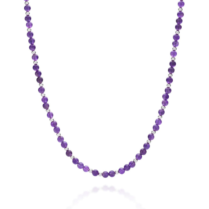 This handcrafted necklace features a 4mm semi-precious natural amethyst gemstone and eco-friendly sterling silver beads, finished with a silver chain.