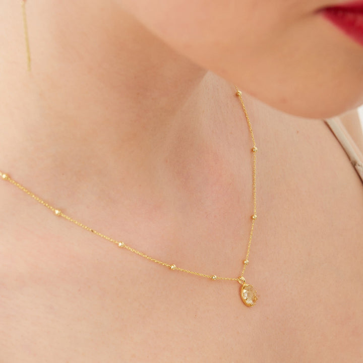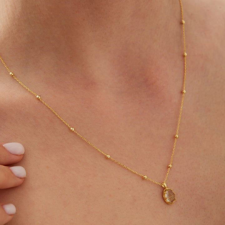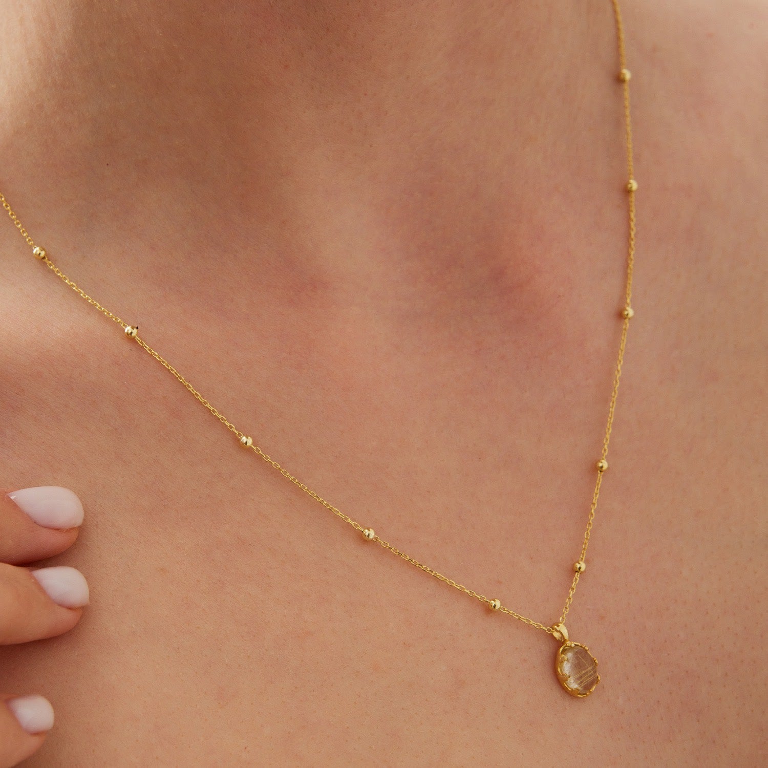 This necklace is handmade from 925 recycled sterling silver and features a transparent moonstone pendant. The dainty beaded chain is dipped in a luxe gold tone. It has an adjustable lobster claw closure.