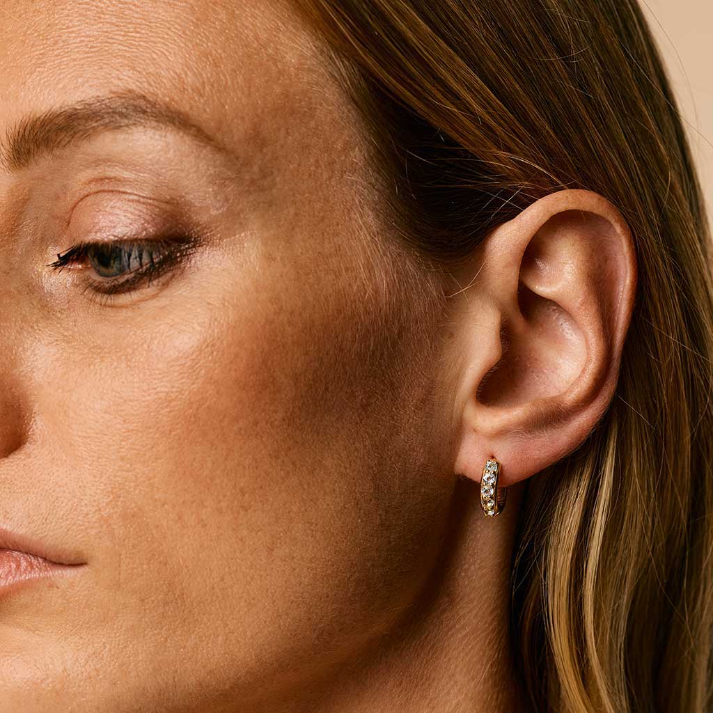 These huggie hoop earrings are made with 24ct Gold Plated Recycled Brass and feature Blue Topaz gemstones. They are hypoallergenic and nickel-free.