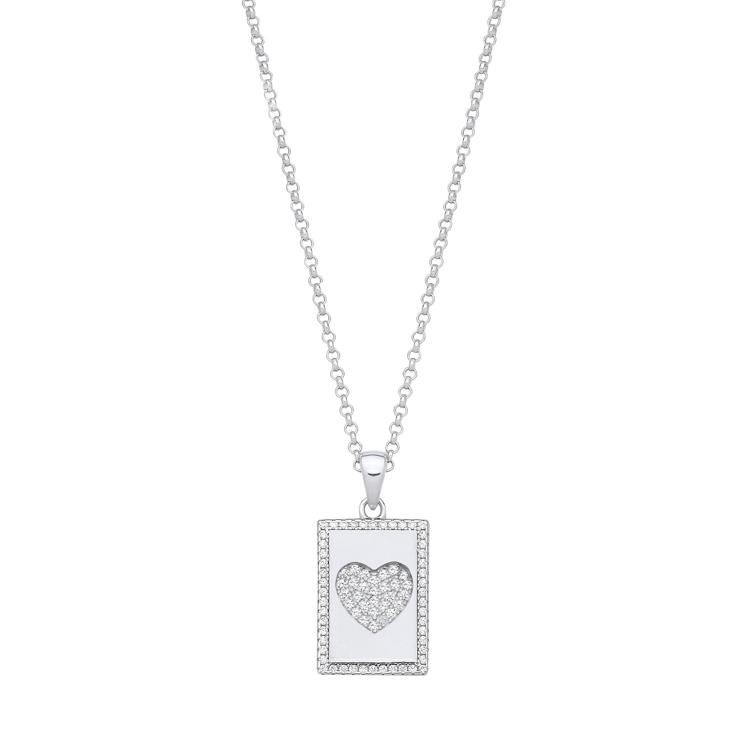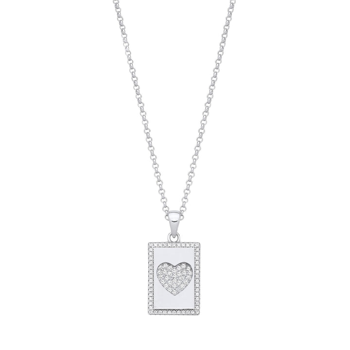 This necklace is crafted from 925 sterling silver. It features a 24mm x 12mm pendant with a 1.8mm depth, a cubic zirconia heart accent, and is suspended from a 16-inch chain.