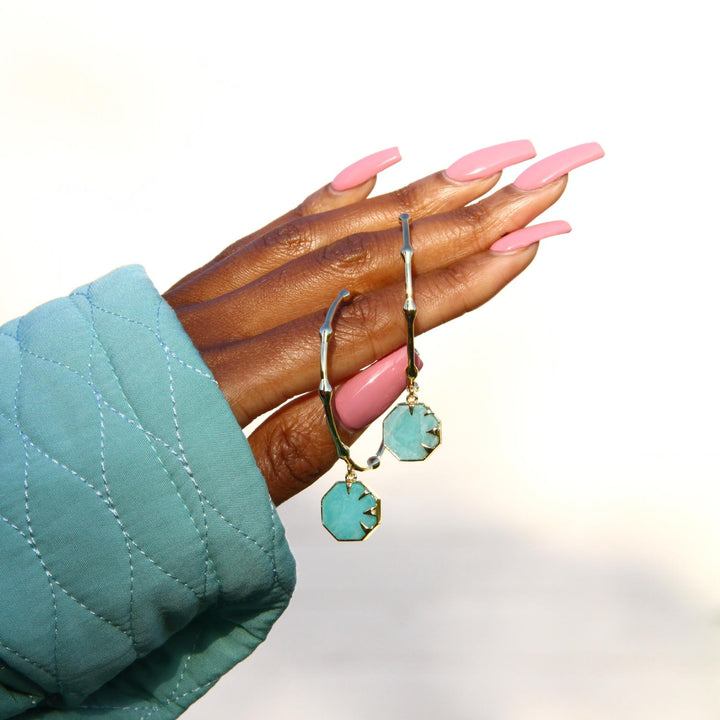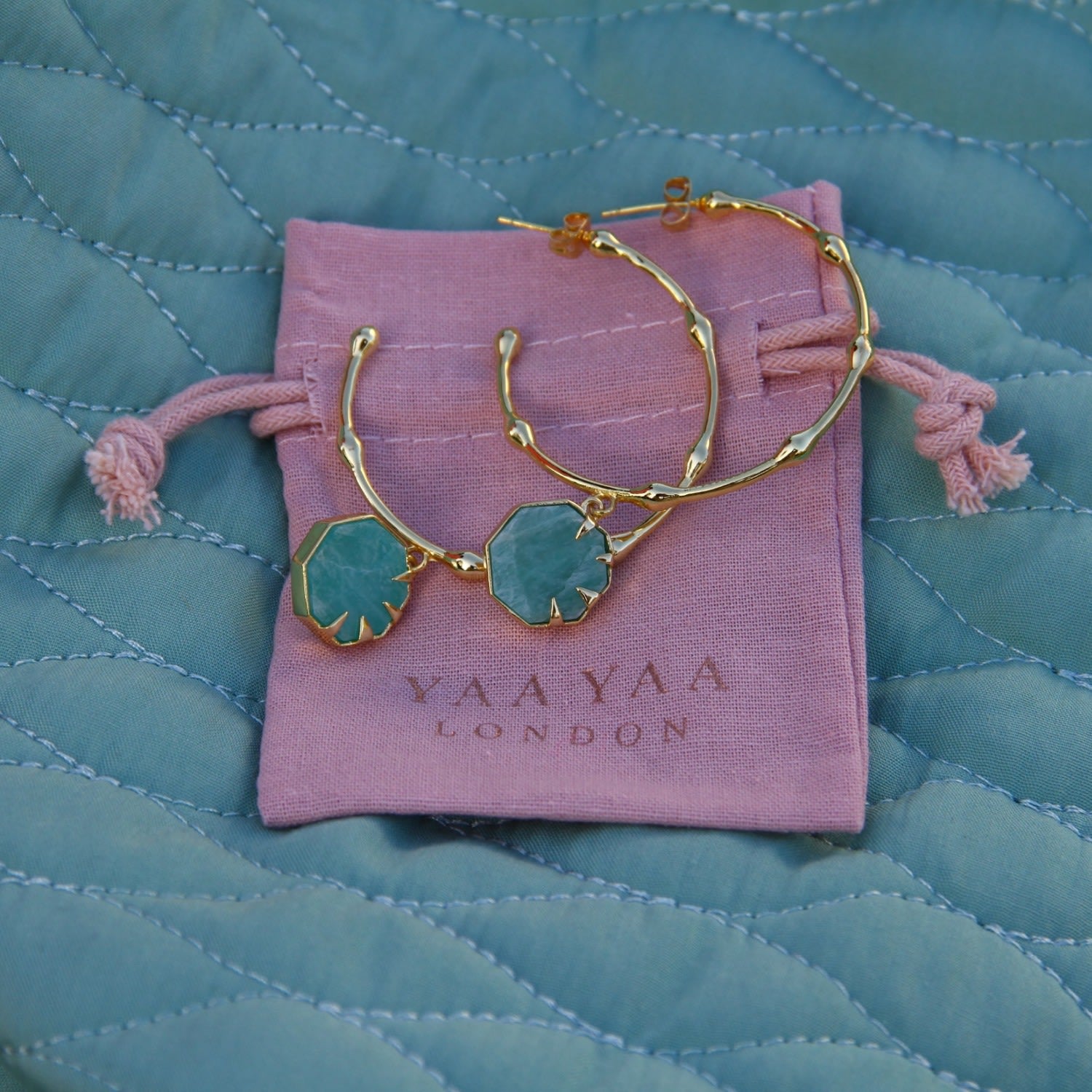 The Hold On Amazonite Gemstone Large Hoop Earrings by Yaa Yaa London are a bold and meaningful accessory. The 'Hold On' collection is inspired by a "never give up" ethos. These large hoop earrings feature a rough-cut amazonite gemstone in youthful shades of peppermint and turquoise. The golden claws holding the stone symbolize strength. The simple hoop design allows them to be worn with anything, making them a versatile and empowering statement piece.