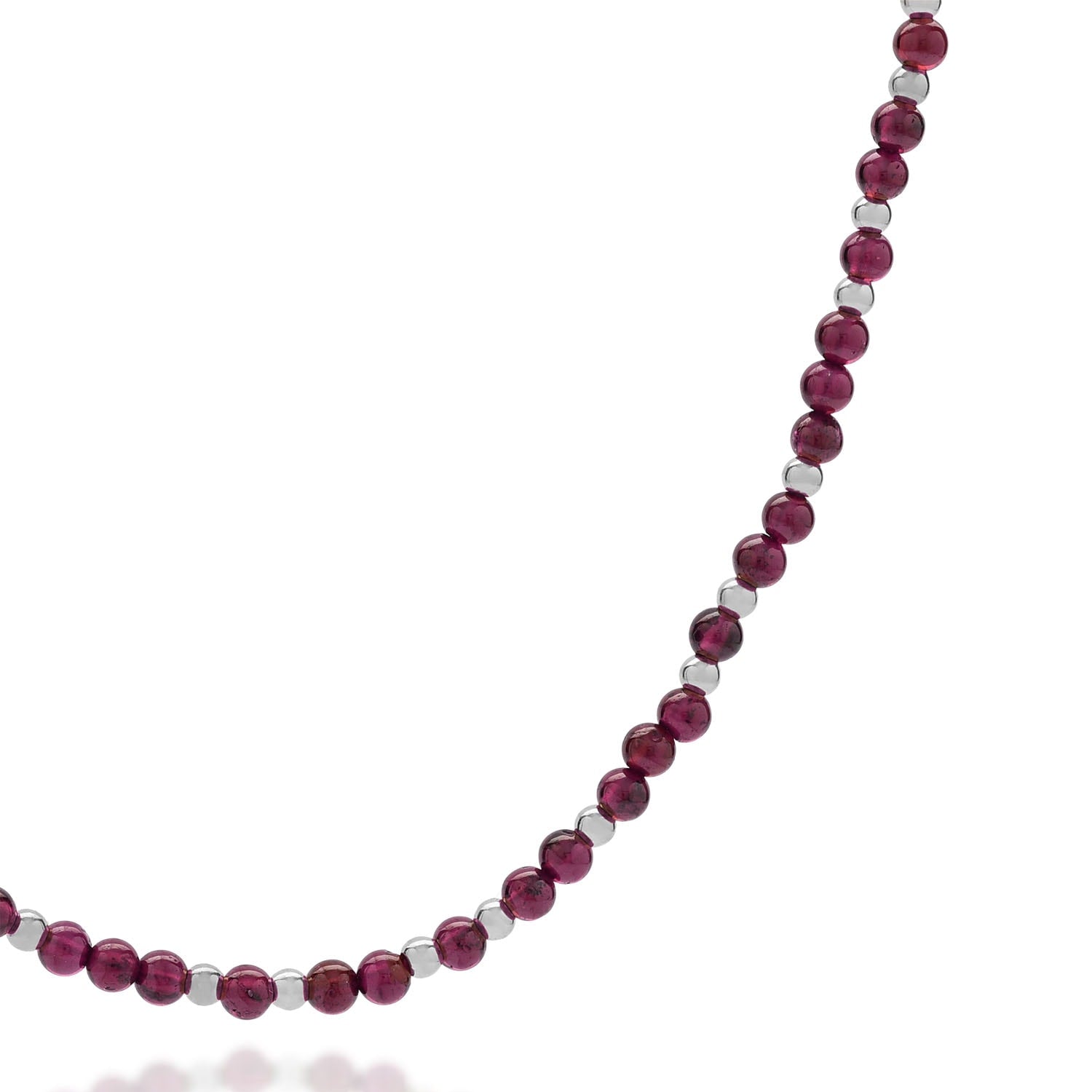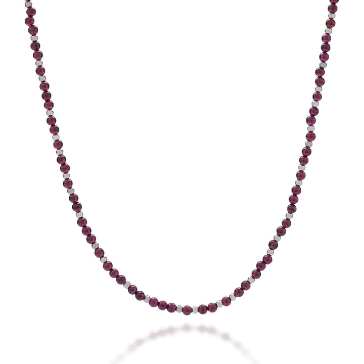 This necklace is handmade with natural garnet gemstones and eco-friendly sterling silver beads. It is also available in 18ct gold-plated sterling silver.