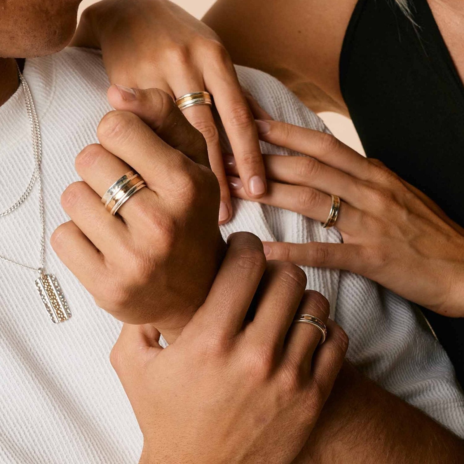 This ring is handmade with recycled sterling silver and mixed metals. It features a spinning band designed to soothe stress.