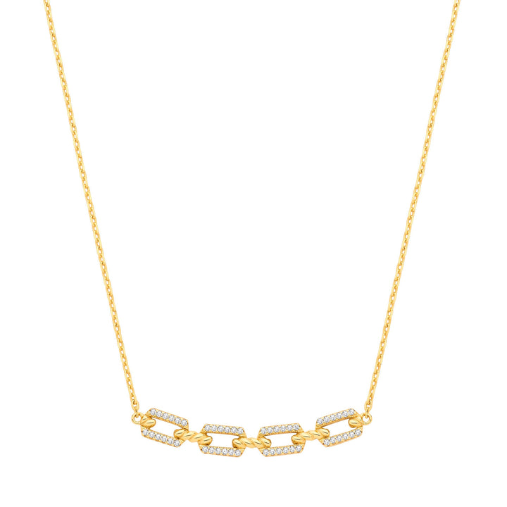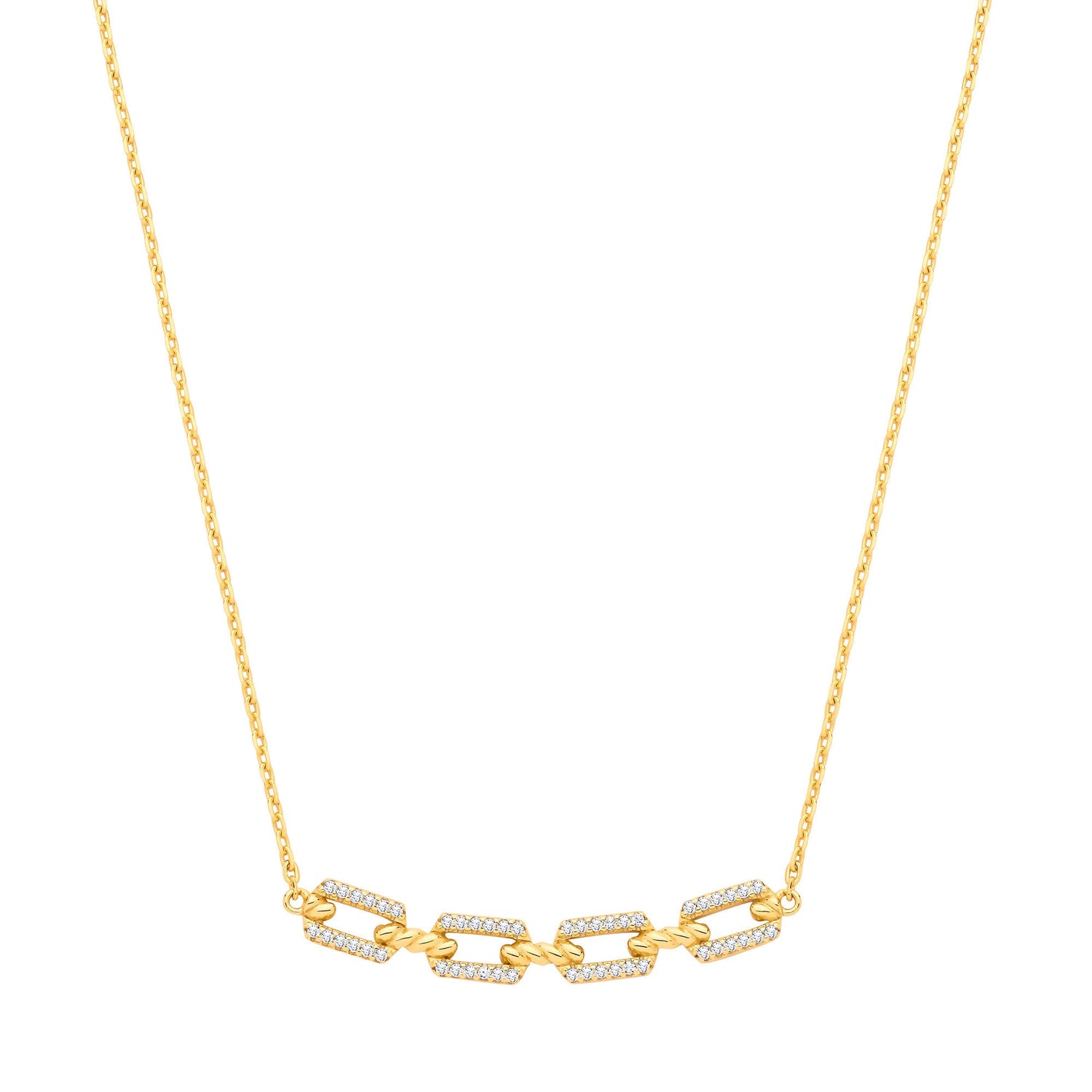 This necklace features a 35.3mm paperclip pendant with cubic zirconia stones. It is crafted from sterling silver with 18K gold plating and is an 18-inch adjustable to 16-inch necklace with a 4.9mm wide silhouette.