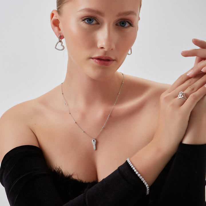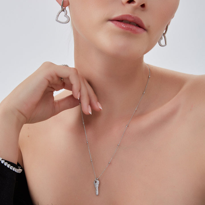 This necklace is crafted from 100% fine sterling silver and features a beaded chain with a key pendant.