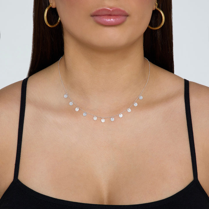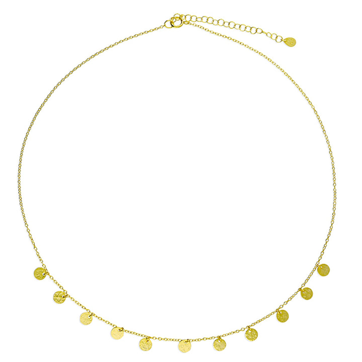 This necklace is crafted from sterling silver with 21 carat yellow gold plating. It features a trace chain and textured flat discs.