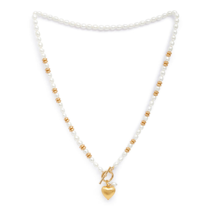 This necklace is made with oval cultured freshwater pearls, gold hematite beads, a gold-plated toggle clasp, and a gold vermeil heart charm.