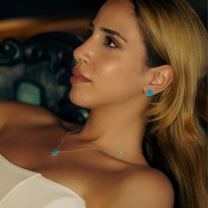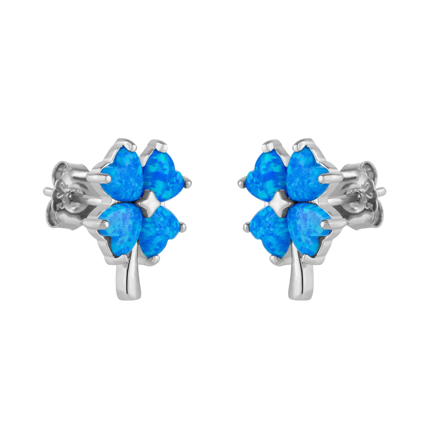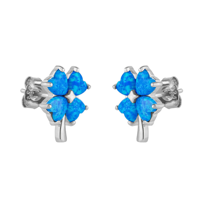 These stud earrings are crafted from sterling silver and feature blue opal stones in a four-leaf clover design.