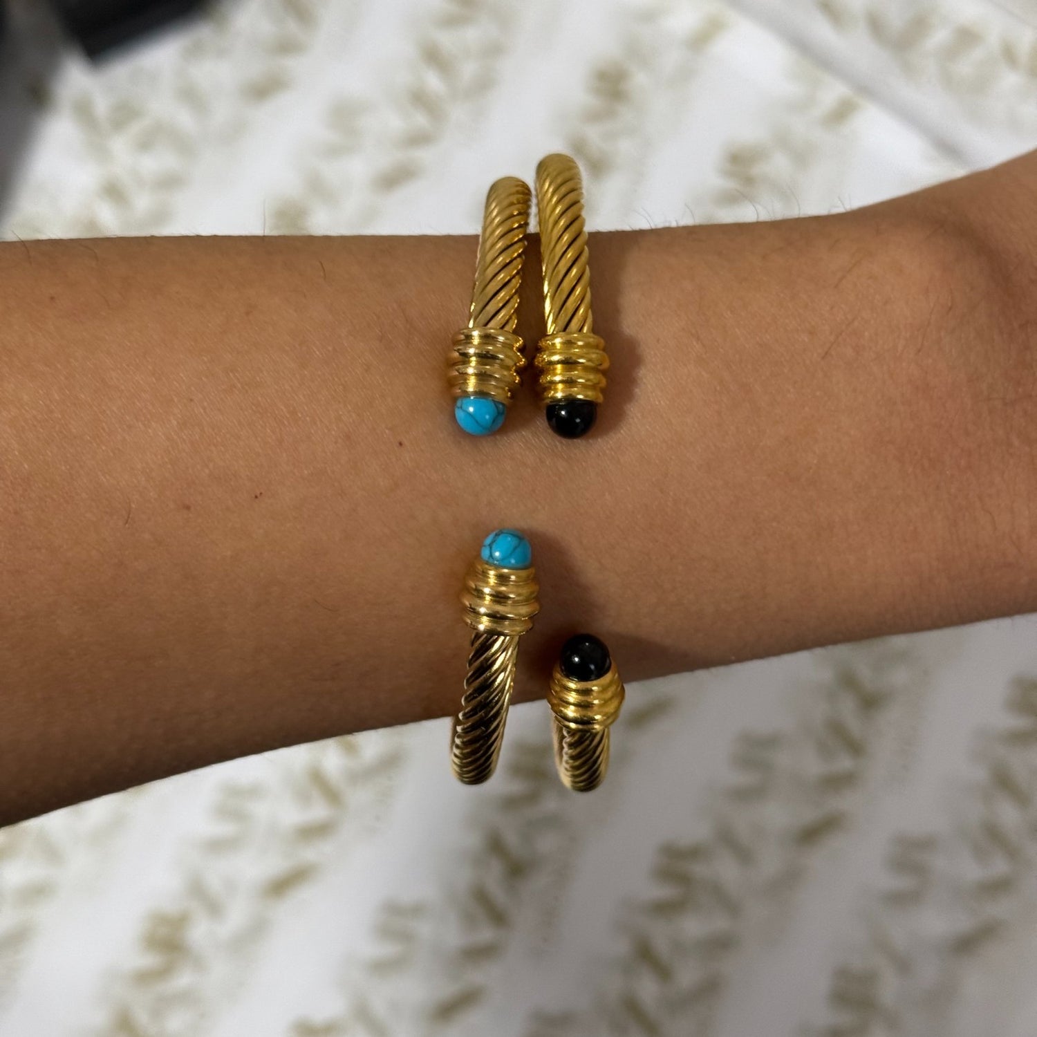 This Gold Turquoise Twist Bangle by Nazzar blends classic sophistication with vibrant color. Its twisted gold cuff is finished with striking turquoise stones at each end—symbols of protection and vitality. Both vintage in charm and modern in execution, this bangle is a versatile piece that radiates confidence.