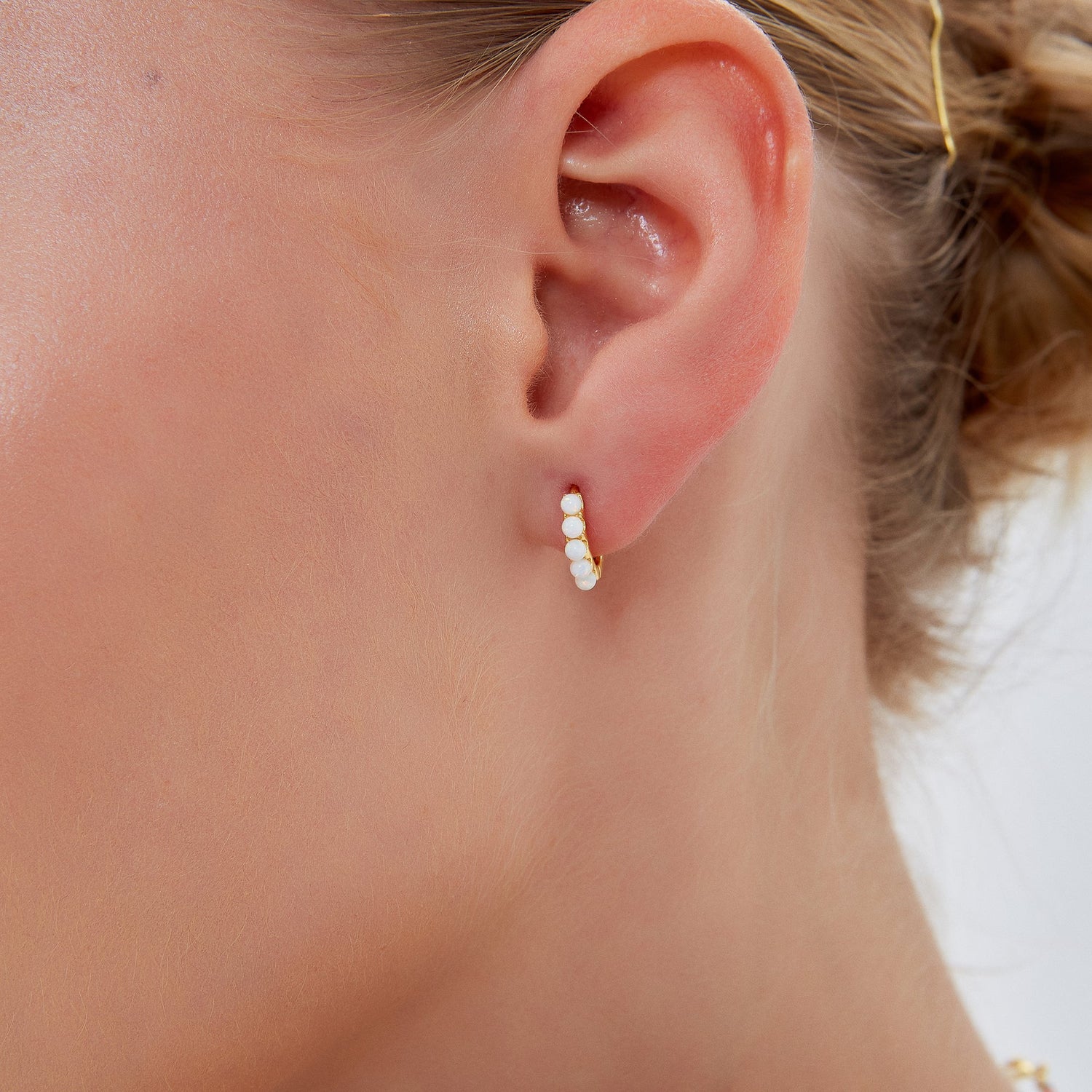 These huggie hoop earrings are made from 100% recycled sterling silver and feature delicate beading and white opal stones.