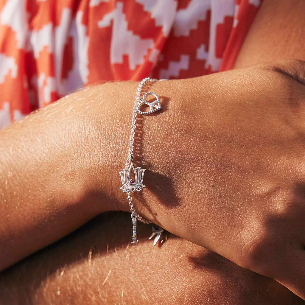 This Peace, Love and Freedom Silver Charm Bracelet by Charlotte’s Web Jewellery is a talisman of unity. With charms symbolizing serenity, spirituality, freedom, protection, and peace—including a Buddha, lotus, swallow, Hamsa, and heart—it is a wearable manifesto for kindness and hope. Each charm tells a story, making this bracelet a deeply symbolic piece of jewelry.