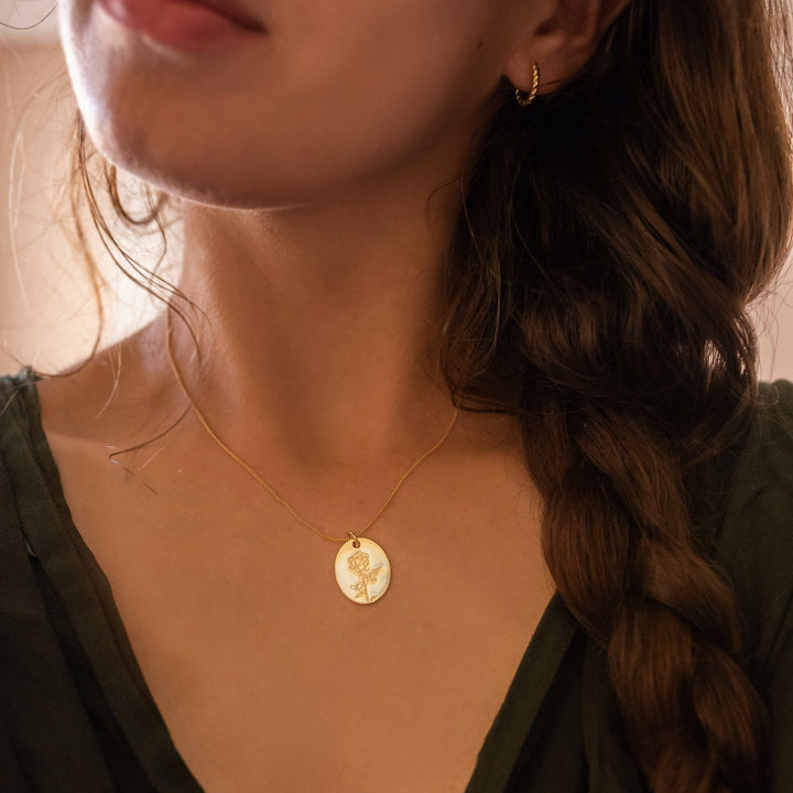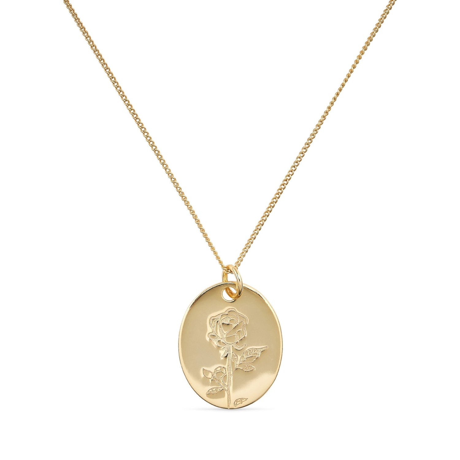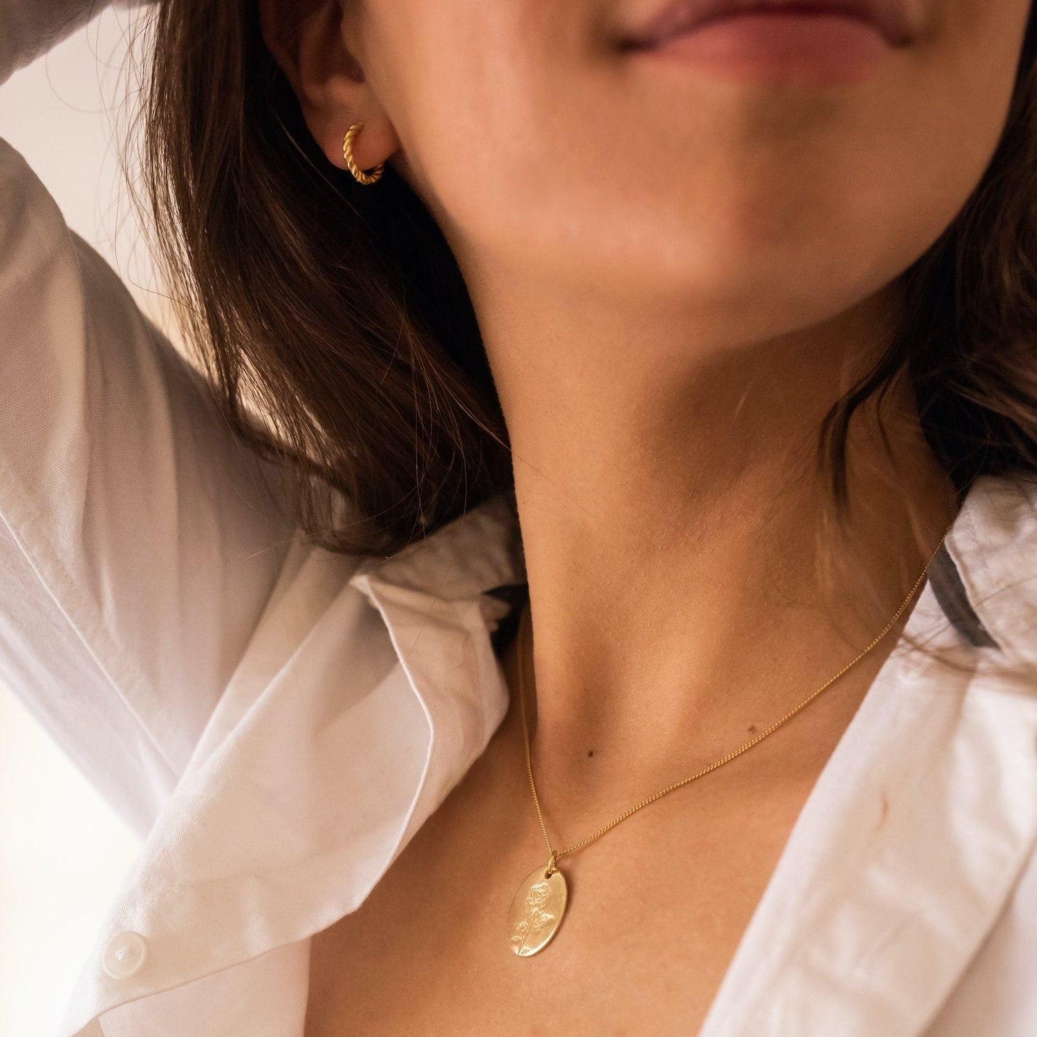 This Gold Rose Flower Necklace by Elk & Bloom is a perfect accessory for anyone who wants a little sparkle and a lot of elegance. The necklace is made entirely of solid sterling silver and then coated in genuine 18k gold plating. It features a small oval coin pendant with an engraved image of a delicate rose, symbolizing timeless beauty and grace. The chain comes with an extender, making it a versatile piece for all necklines and a perfect gift.