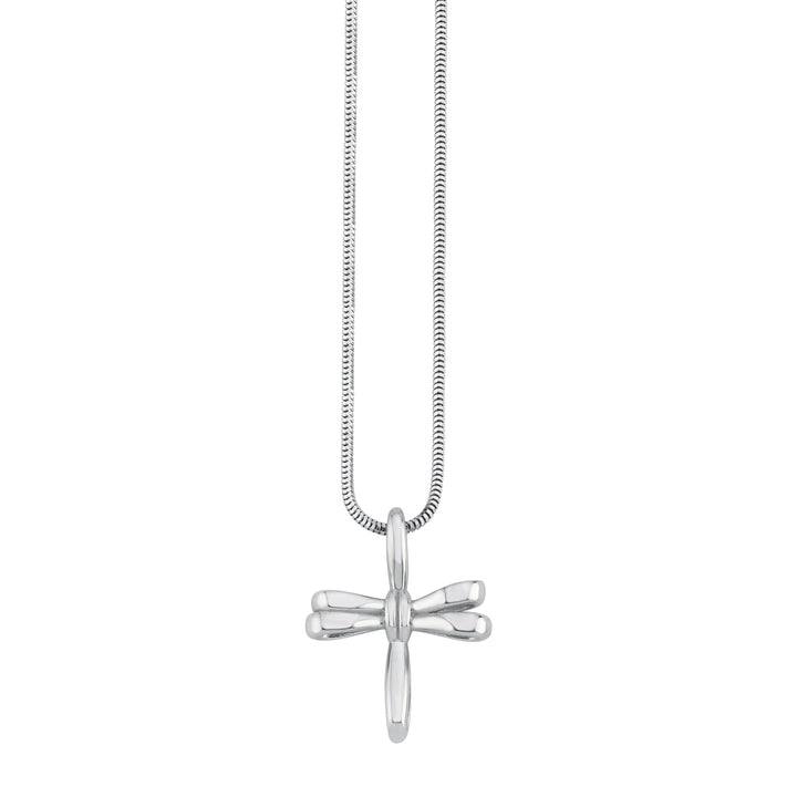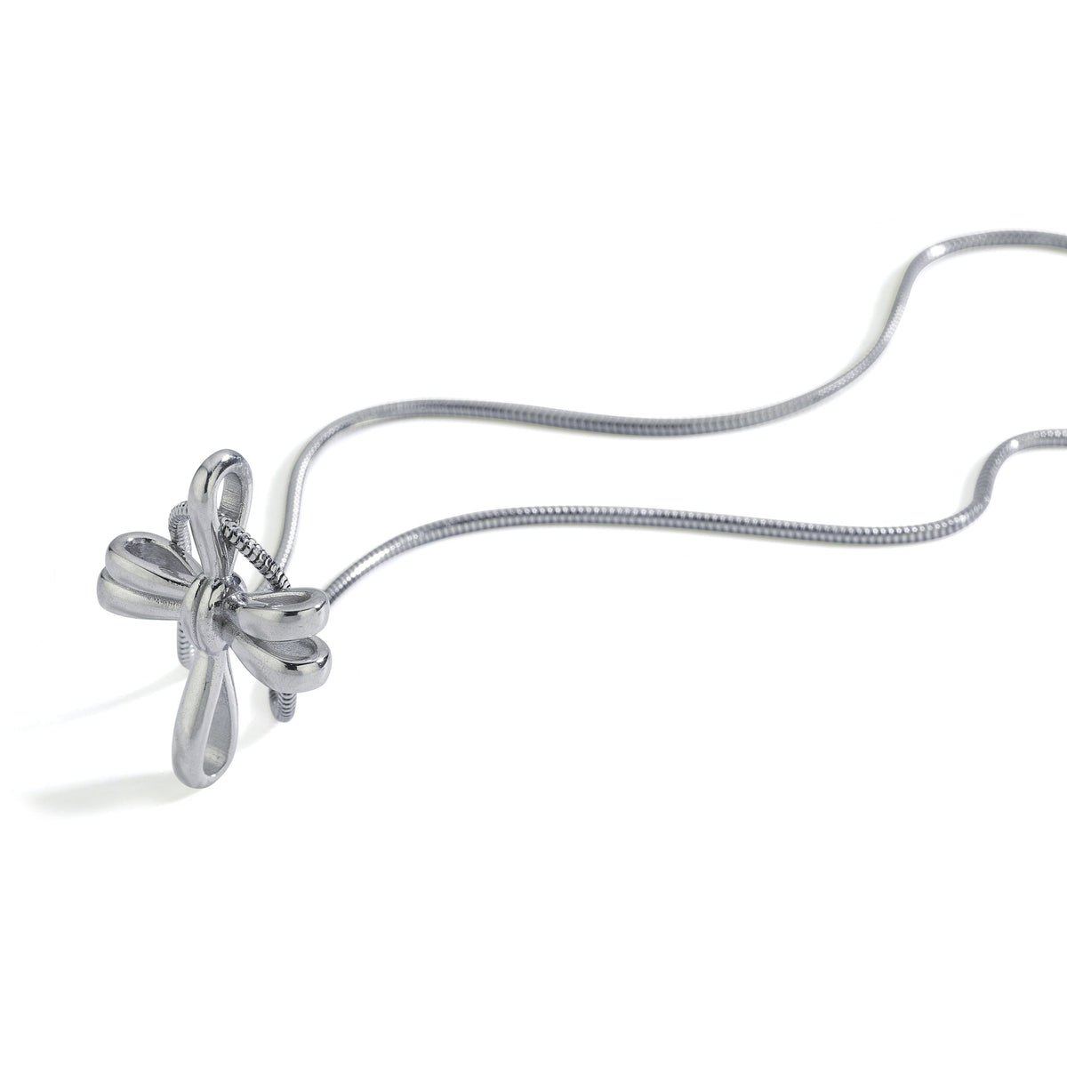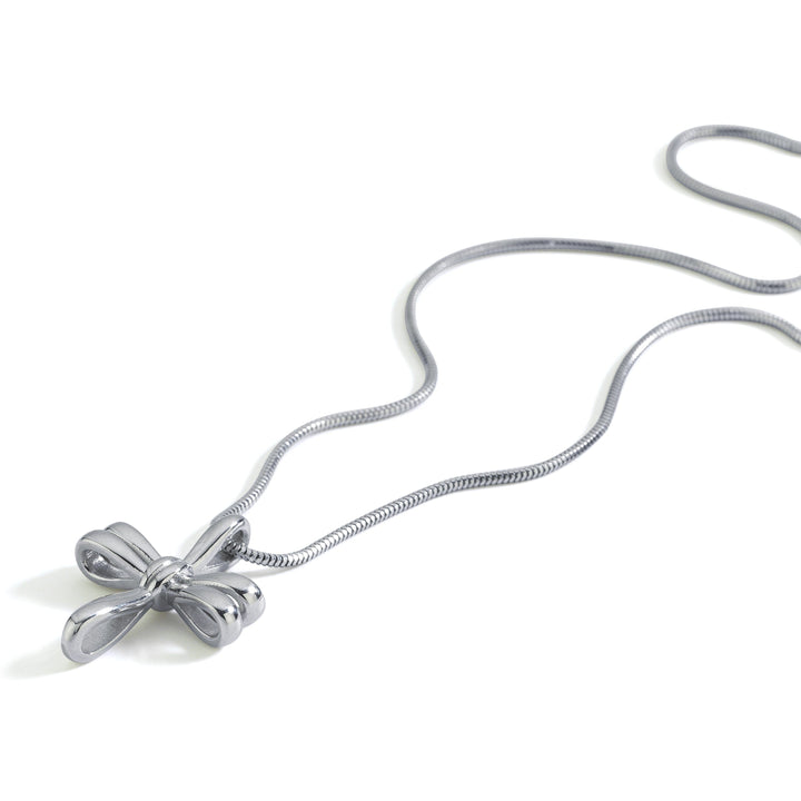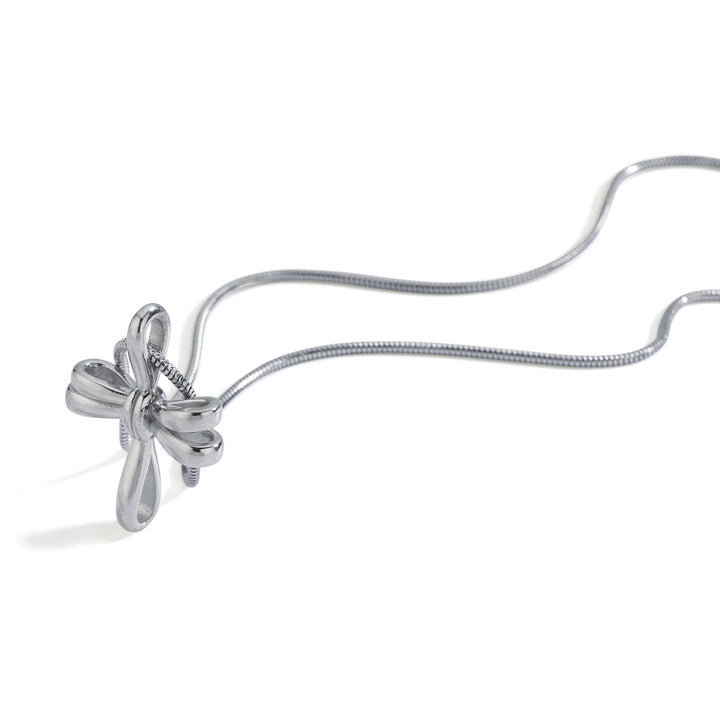 Crafted in 925 sterling silver, plated with rhodium for durability and high shine. Bow-shaped sculptural pendant on silver chain. Unisex design.