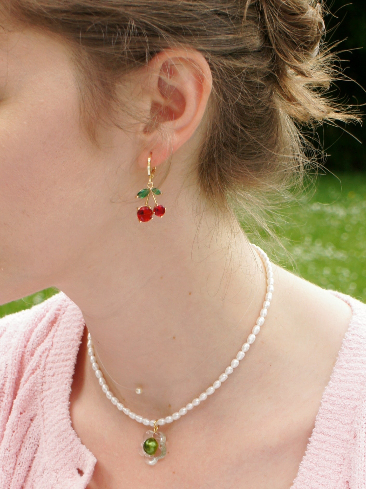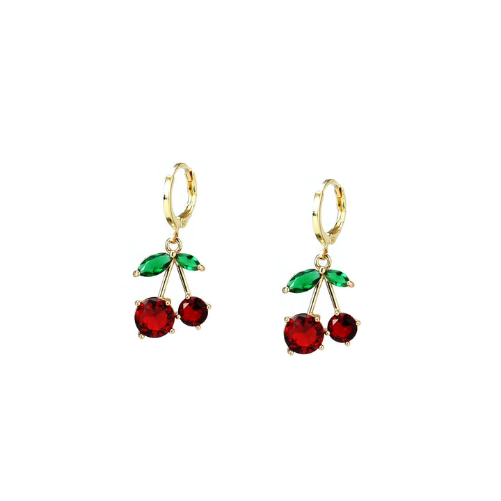 These earrings are hypoallergenic and made from 18k gold-plated brass with a cubic zirconia (cz) crystal cherry charm.