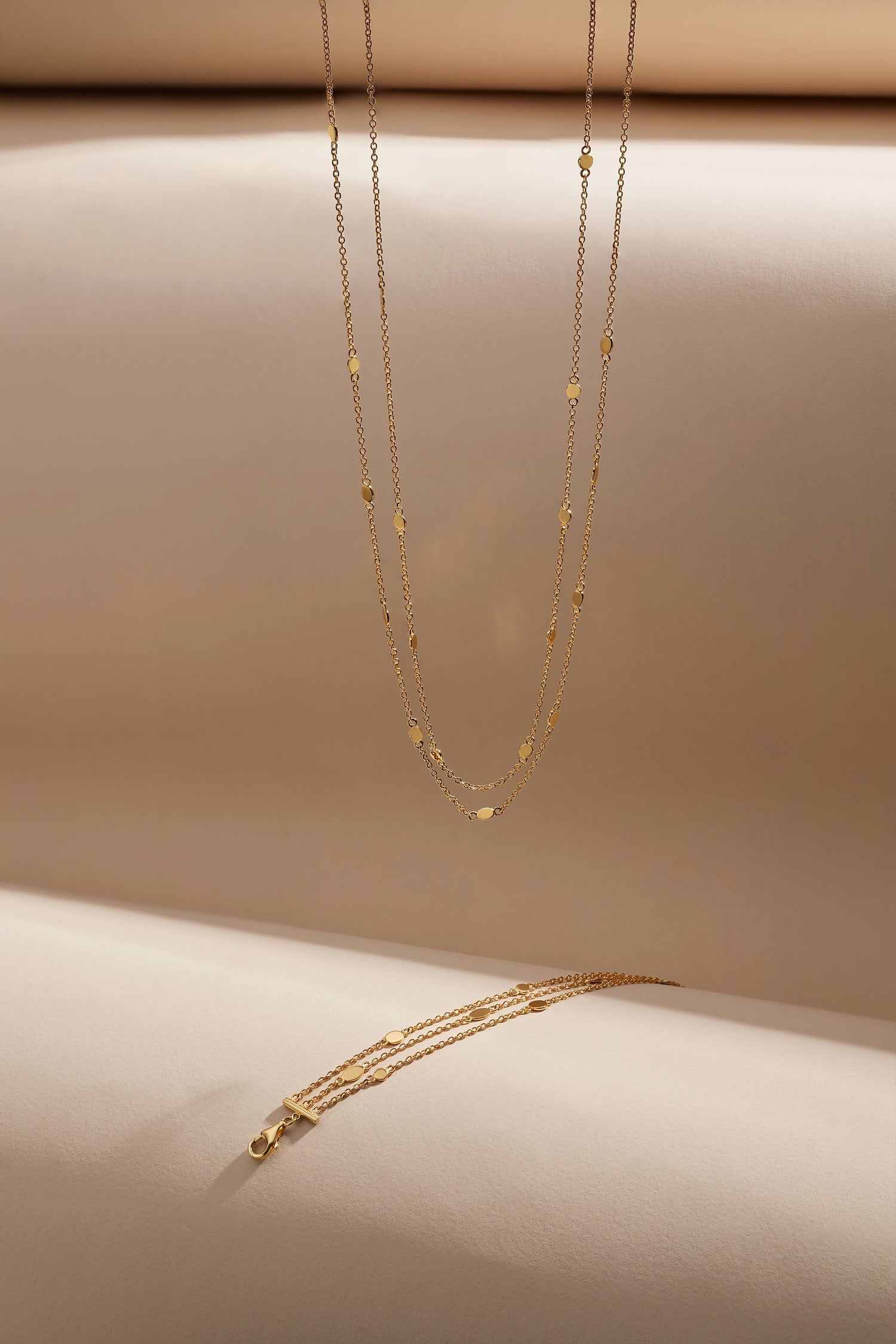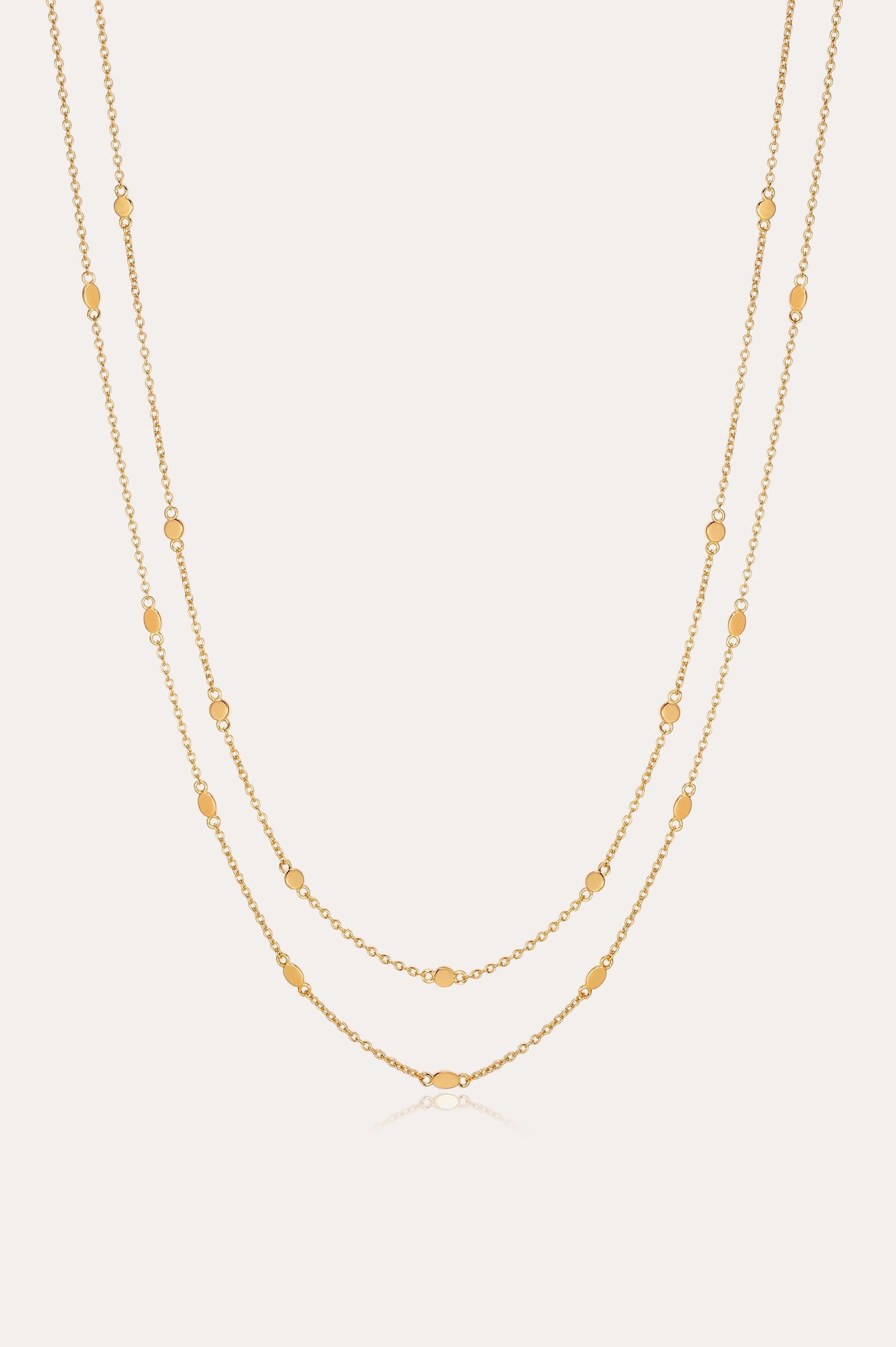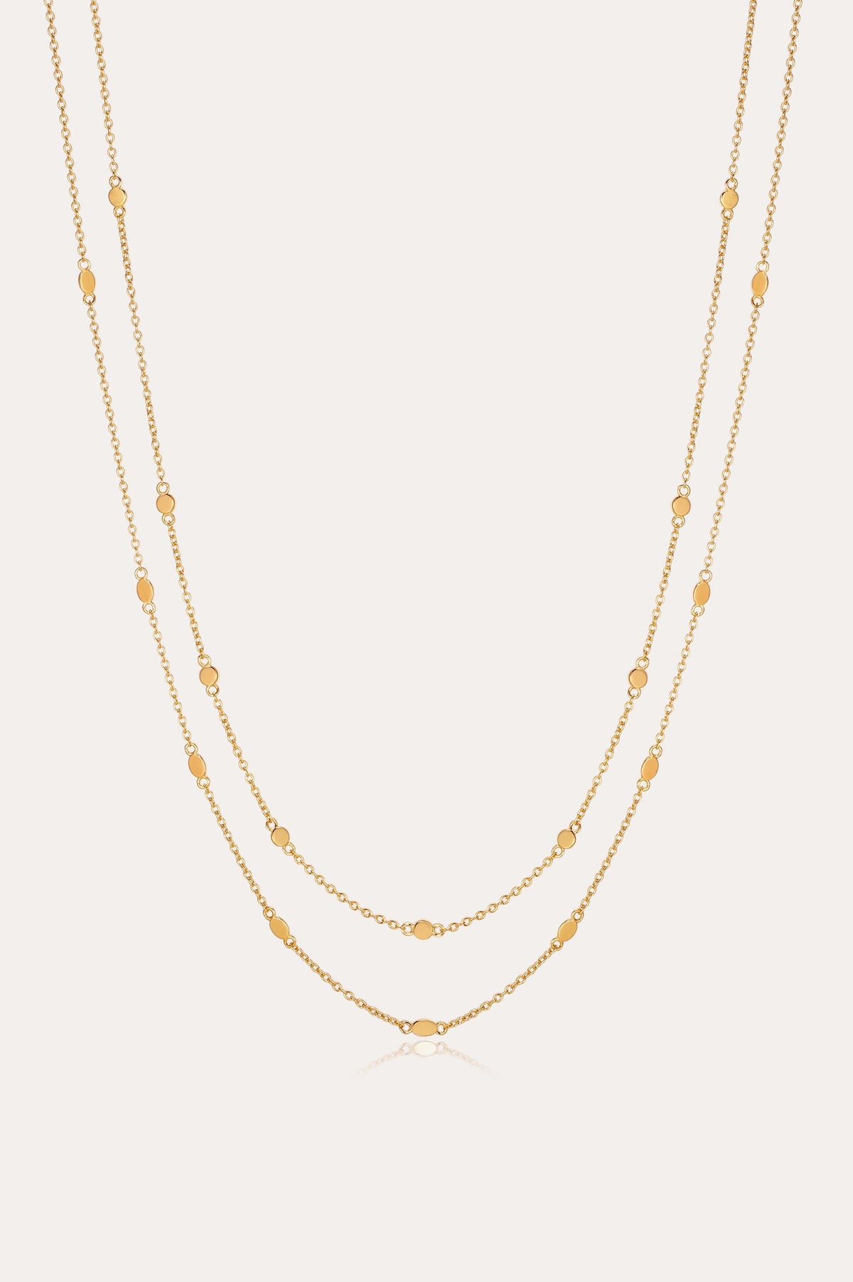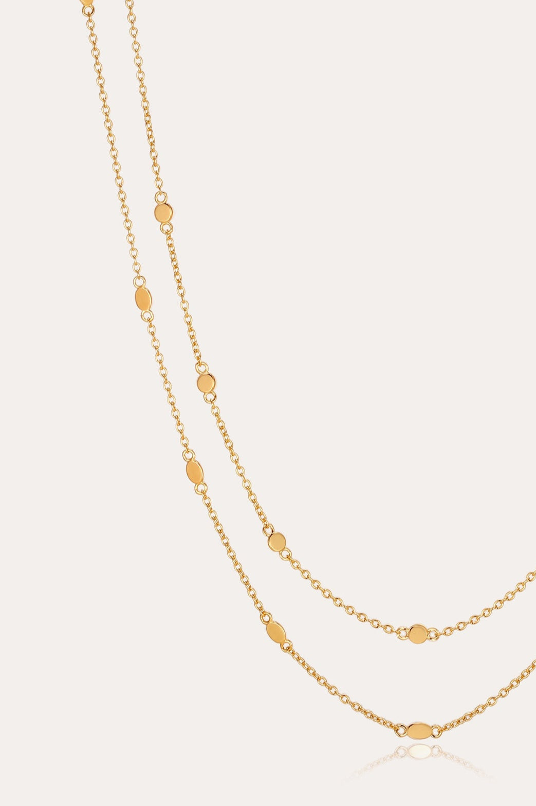 This necklace is made of 18k gold plated sterling silver. It features two chains and a lobster claw clasp.