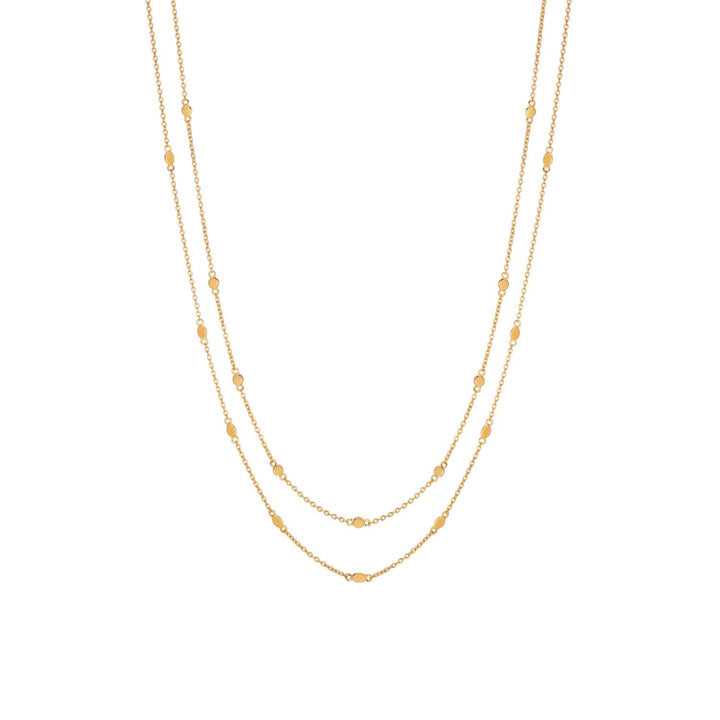 This Simona Double Chain Stacking Necklace In Gold by Vanchi is a best-selling accessory that offers a refined, layered look with a single piece. It features two chains with flat oval detailing, fastened with a lobster claw clasp. This necklace is perfect for creating contrast and a styled vibe, while the 18k gold plating on a sterling silver base ensures long-lasting brilliance.