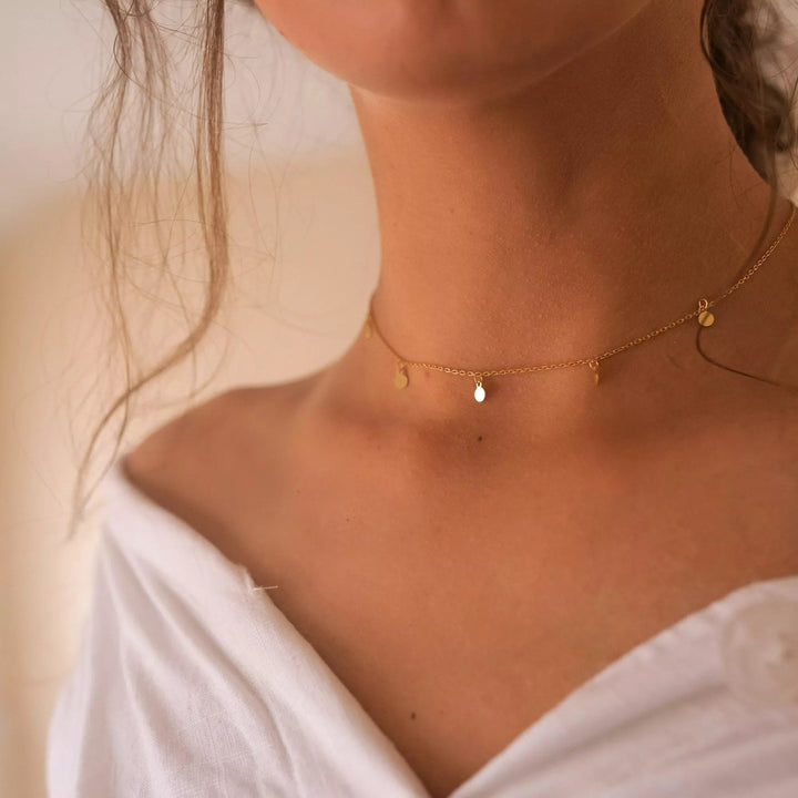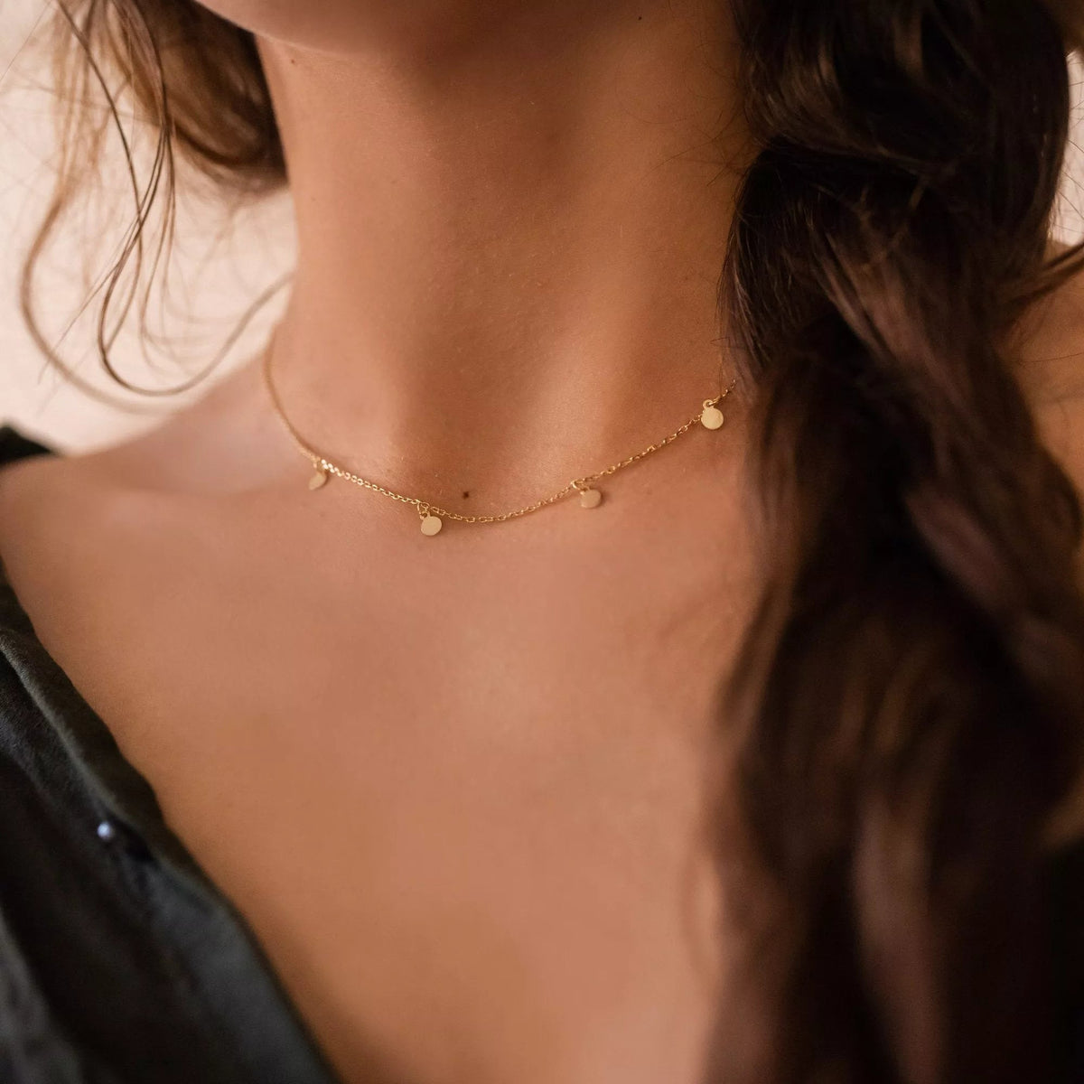 This choker necklace is made of solid sterling silver coated in genuine 18k gold plating. It has a small beaded circle design and is adjustable from 39cm to 45cm.