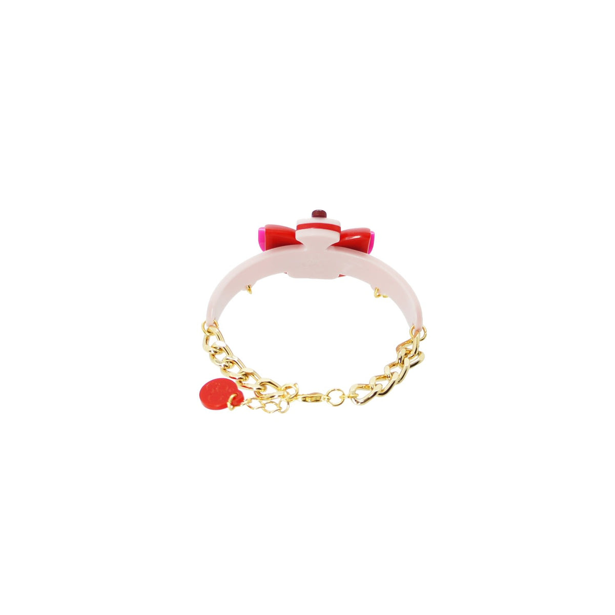 This bracelet is handmade from acrylic. It is adorned with glass rhinestones, an ABS bead, and golden finished brass chains. It is available in sizes XS/S/M/L.
