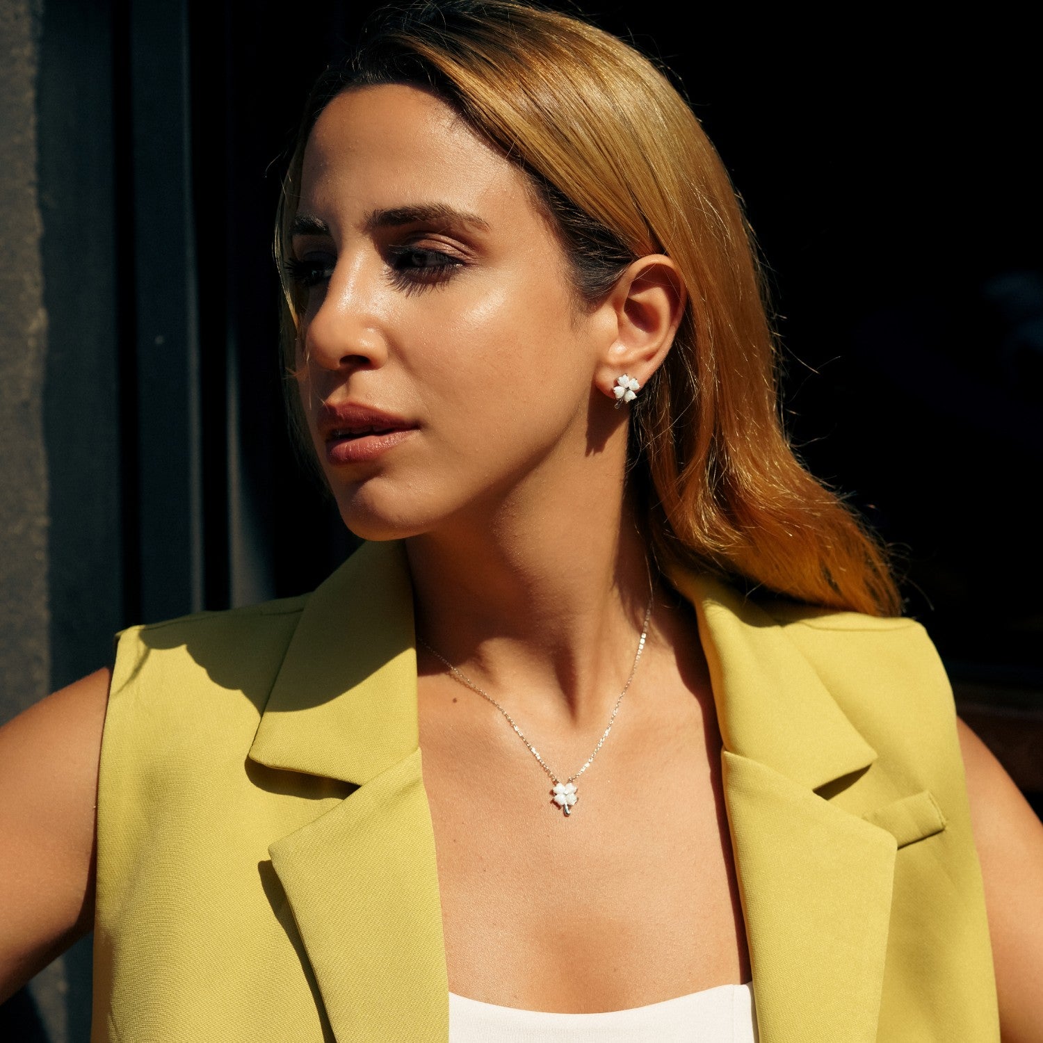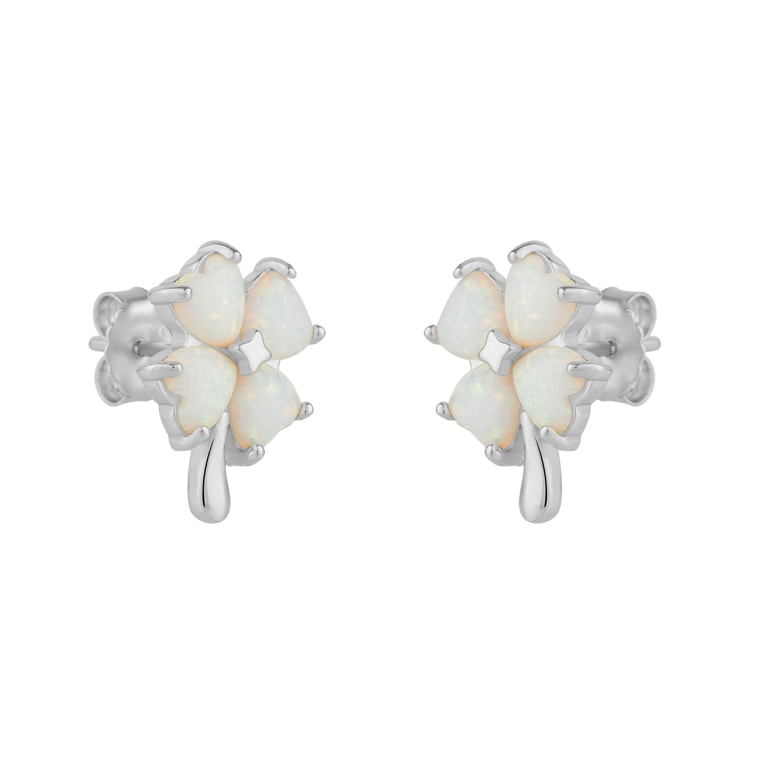 These stud earrings are crafted from 100% fine sterling silver and feature a white opal in the shape of a four-leaf clover.
