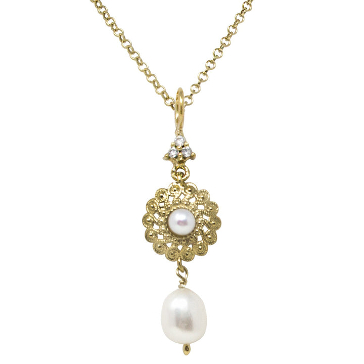 This Filigrana Gold-Plated Pearl Necklace by Vintouch Italy channels baroque artistry through modern craftsmanship. A freshwater pearl is suspended beneath an ornate charm, crowned with a crystal-encrusted triangle bale. Each detail reflects timeless elegance and Italian design heritage, resulting in a piece that feels both iconic and unique. Perfect for pairing with matching pieces from the collection.