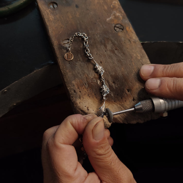 This Bracelet Lilium by Unaloe blooms with the poetic elegance of nature, embodying the symbolism of leaves as eternal guardians of growth and vitality. Inspired by wild beauty, it features a trio of finely detailed leaves connected by a delicate chain, finished with rose-gold plating that adds warmth and refinement. Handcrafted with Italian artistry, the bracelet is a tribute to authenticity and timeless craftsmanship, where each leaf is brunished by hand to achieve depth and contrast. A piece that harmonizes natural symbolism with contemporary elegance, making it perfect for both everyday wear and special moments.