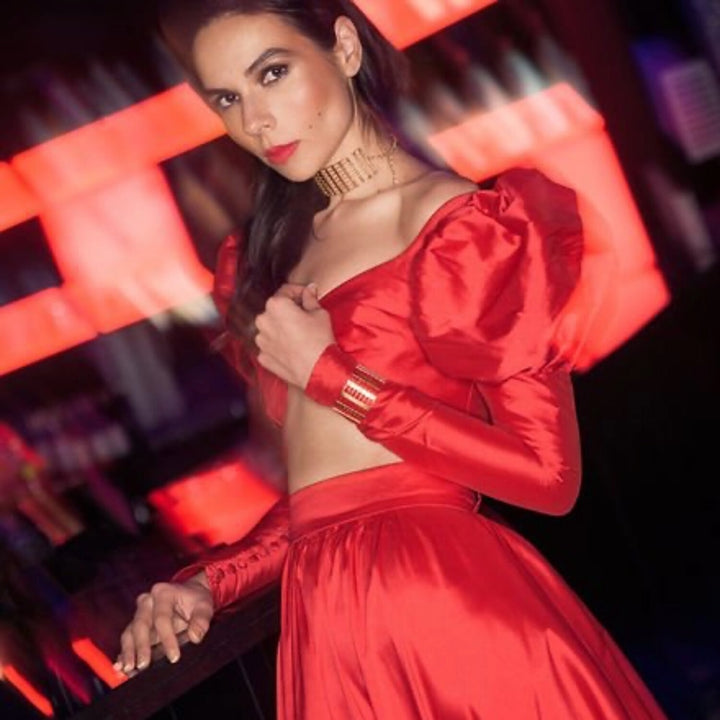 The Gilded Cuff by Meraki by Rashmi Bajaj is a contemporary and sophisticated accessory. This stunning cuff features a series of 24k gold-plated bars arranged in a sleek, open pattern. The fine detailing and geometric structure make it a perfect accessory for both special occasions and everyday wear.