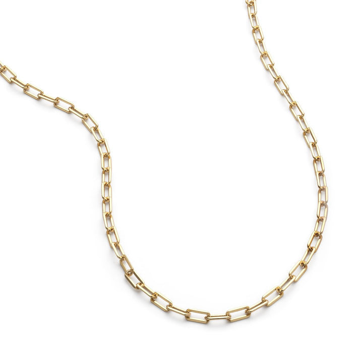 The Thin Paperclip Gold Chain Necklace by Elk & Bloom is a sparkling and stylish accessory. This necklace is made entirely of solid sterling silver and coated in genuine 18k gold plating. It features a rectangle curb chain design and measures 46cm long. This long chain is a perfect gift that will add a little sparkle to any outfit.