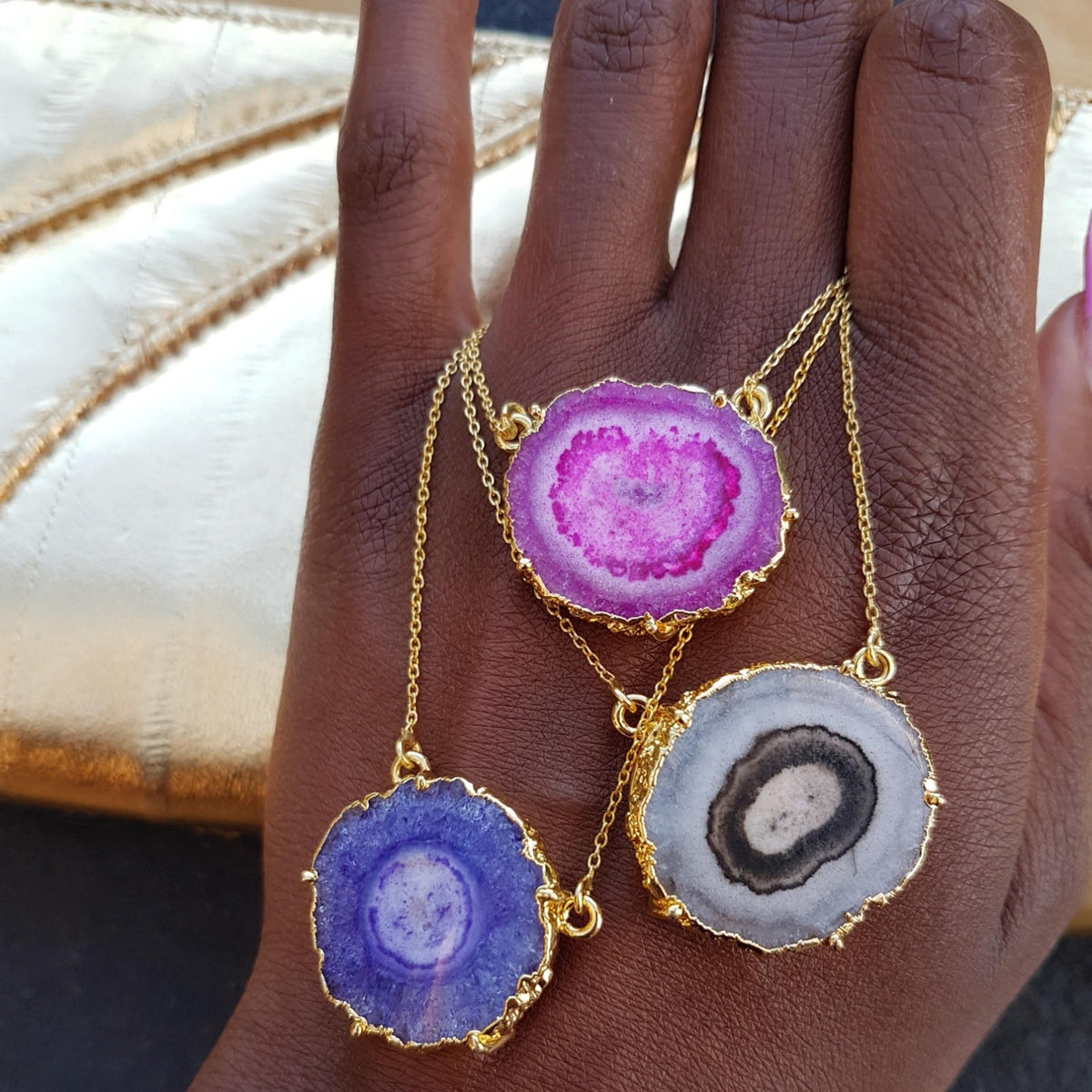 This necklace is made from 925 sterling silver with 1 micron 24k gold plating. It features a solar quartz stone with purple, lilac, and lavender hues.