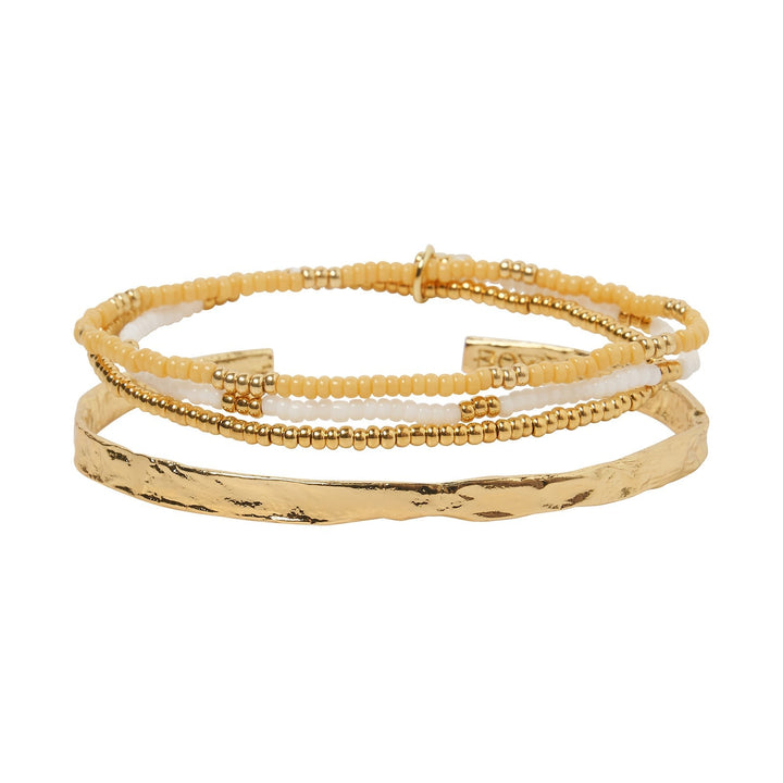 The Sunshine Bracelet Stack - Mango by Arms of Eve is a classic and colorful set perfect for adding a little sunshine to your outfit. It combines a classic gold cuff with three beaded bracelets in a vibrant mango color, offering a cheerful and effortless look. It's a great way to bring a pop of color to your style.