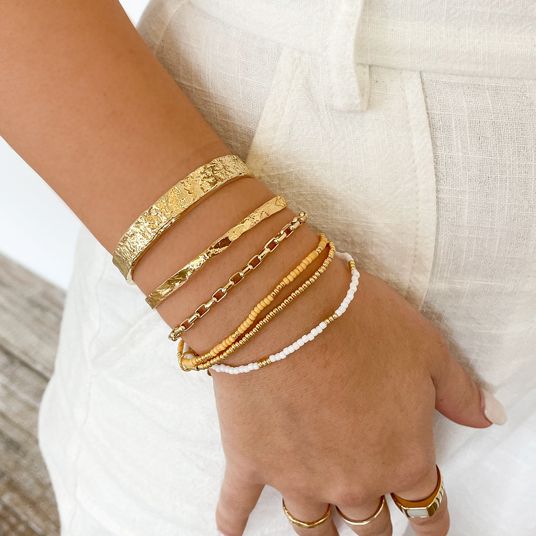 This stack is made from an 18k gold-plated (1 micron thick) cuff and three bracelets with glass beads. The pieces have an e-coating and are lead and nickel-free.