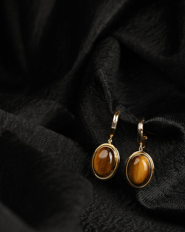 Solid 925 sterling silver earrings with oval Tiger’s Eye gemstones (11.07 carats total), 0.14 carats CZ accents. Total weight: 8.74 g (silver: 6.49 g).