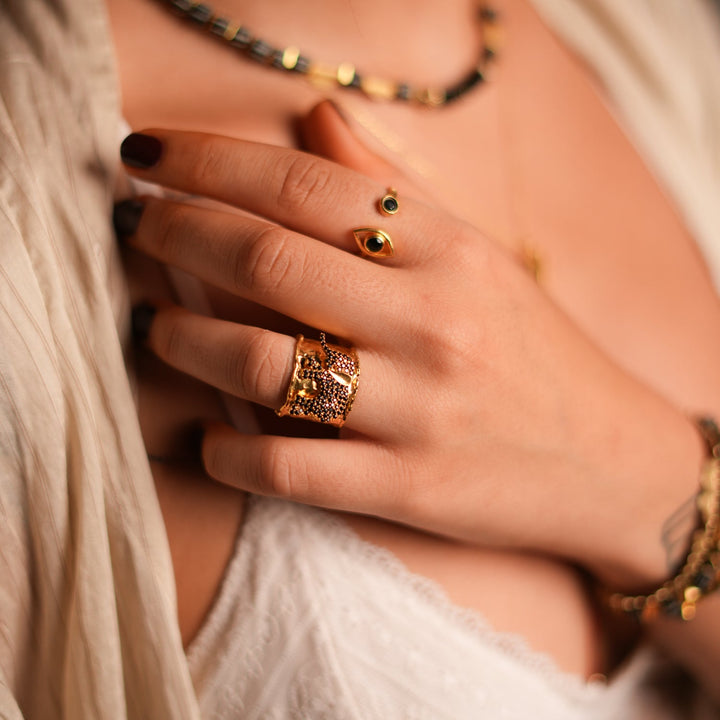 Handcrafted brass band plated in 24k gold. Adorned with two black onyx stones. Adjustable size for versatile fit.