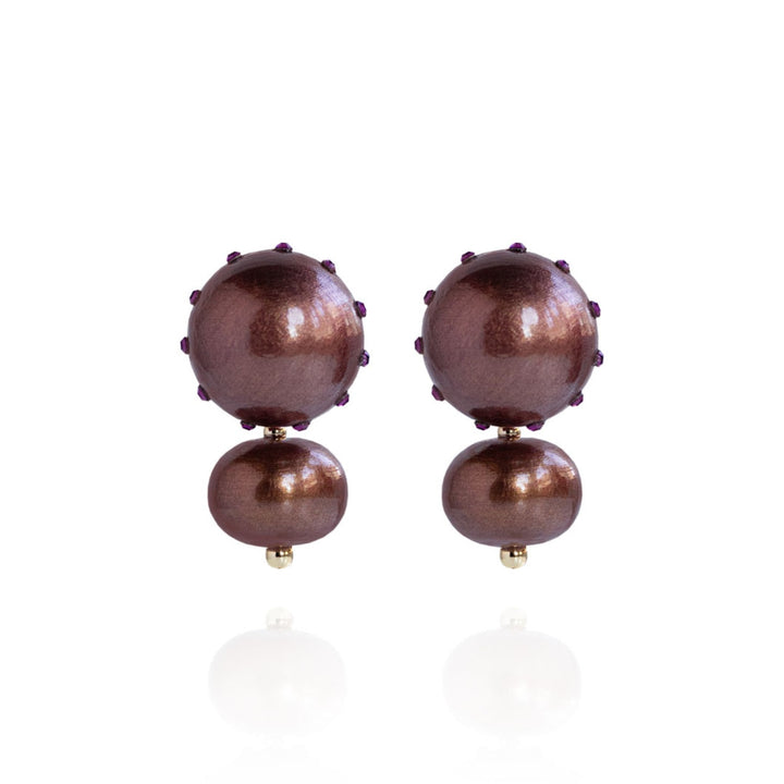 These Livia Earrings in Chocolate Cherry by Saule Label bring an air of elegance and contemporary flair to any occasion. They feature an oversized dome post adorned with delicate Austrian crystal accents, paired with a dangling oval sphere. This seamless blend of classic charm and lively design makes them perfect for parties, the boardroom, or a special night out. Handmade in Detroit, these earrings are a statement of sophisticated style and artisanal craftsmanship.