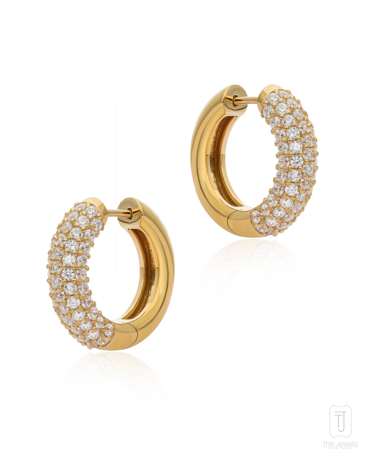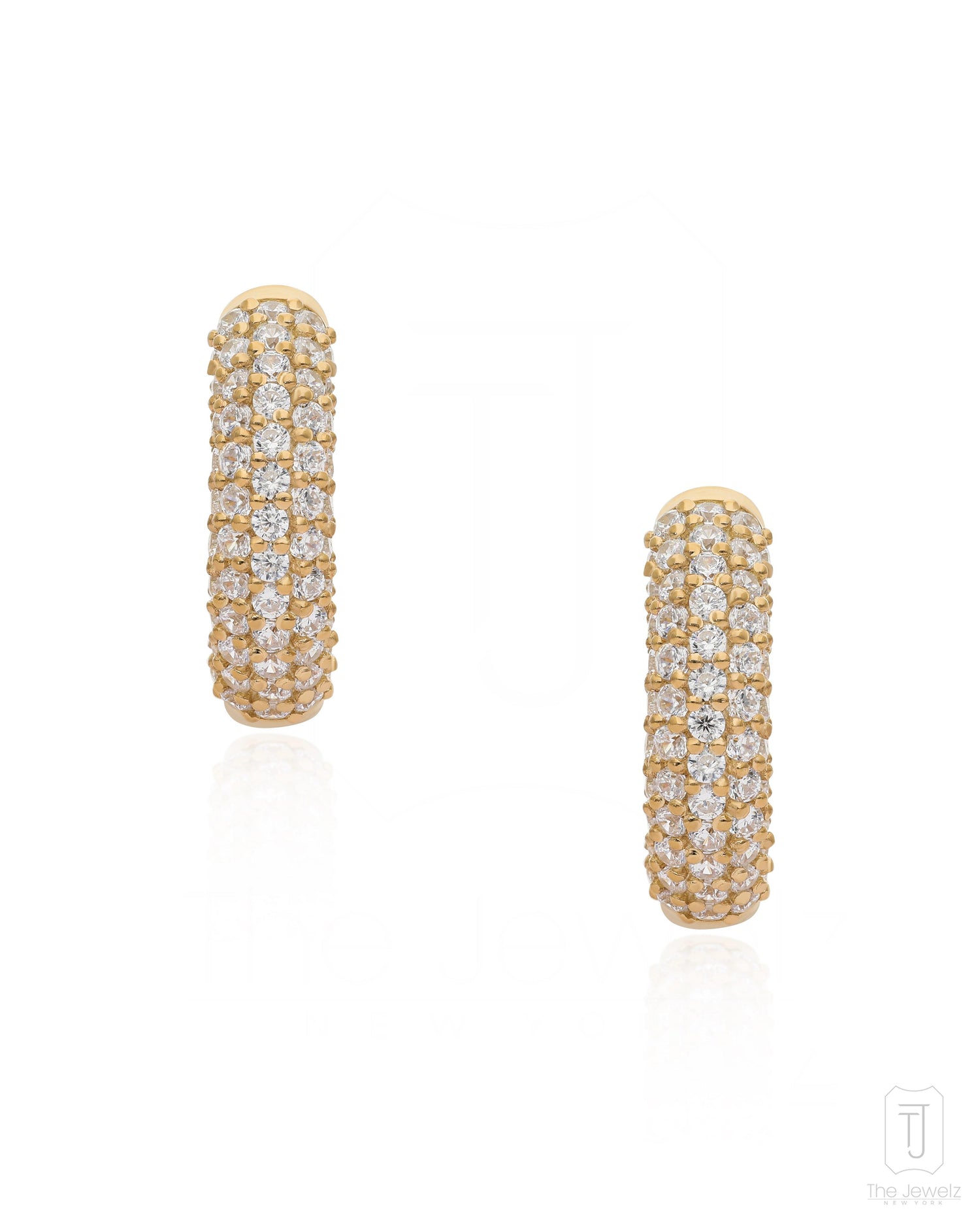 These huggie hoop earrings have five rows of pave cubic zirconia stones and are made from a material with a silver finish. They have a metal weight of 5.78 grams and a total gross weight of 6.43 grams.