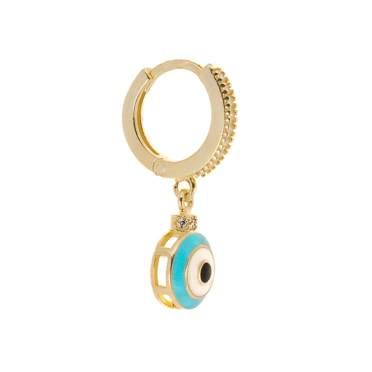 These hoop earrings are crafted from sterling silver with an 18K gold plating and feature an enamel evil eye charm with turquoise and white accents and zircon stones.